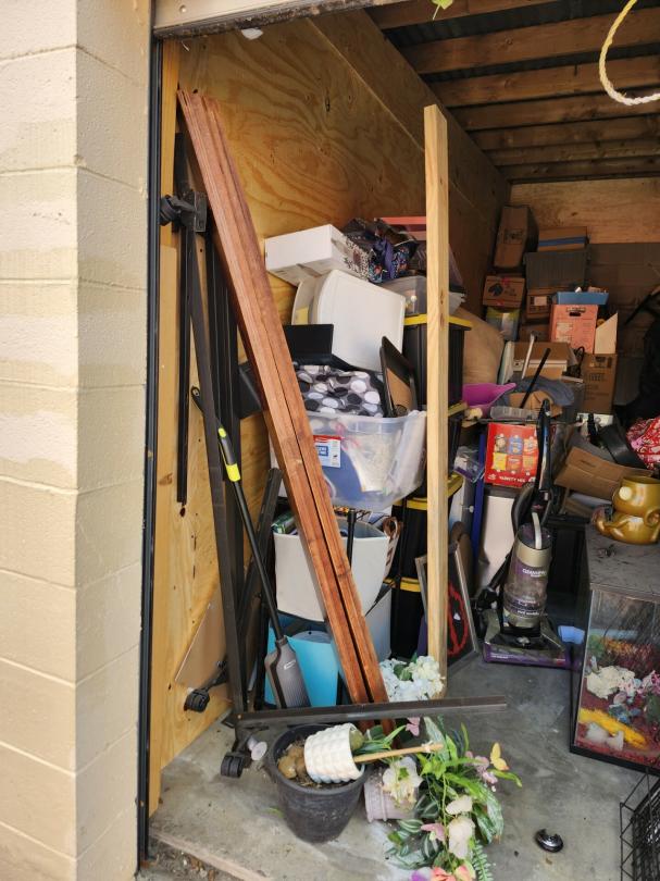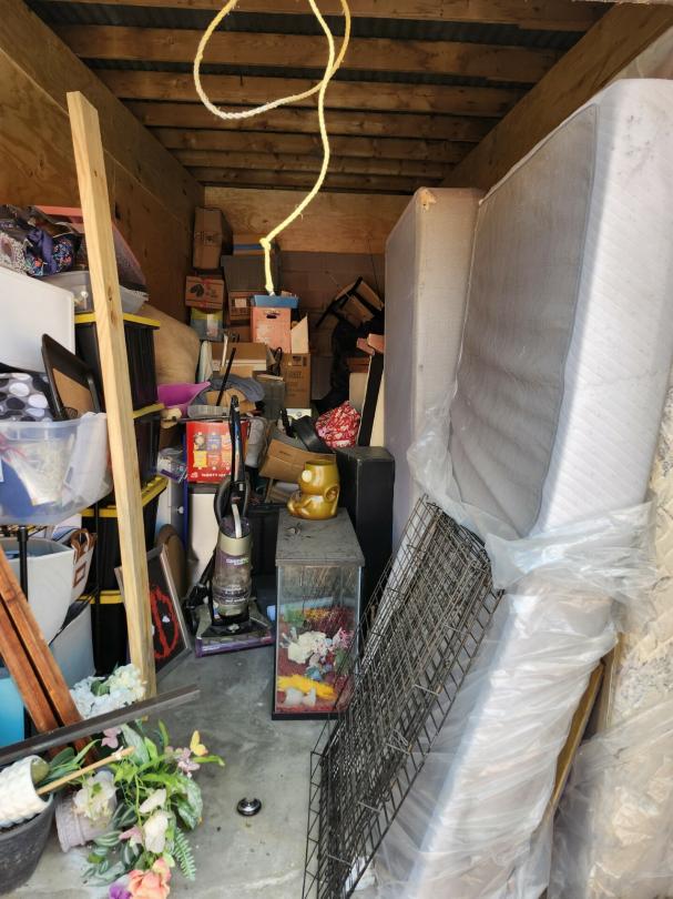 This unit appears to contain…TOTES, BOXES, FURNITURE, VACUUM, MATTRESS, BOXSPRING, FAKE FLOWERS, HOME DECOR, WALL ART