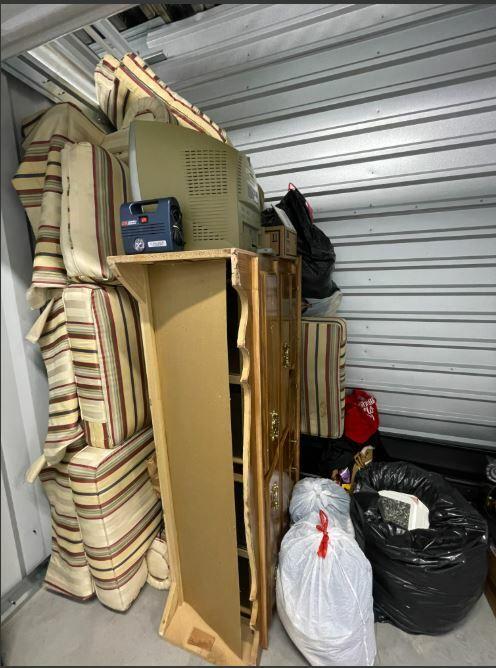 This unit appears to contain…couch, dresser, tv, bags, boxes, shoes, decor, kitchenware
