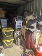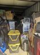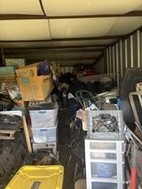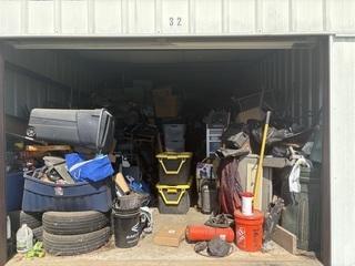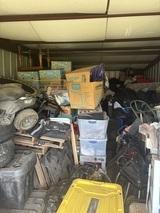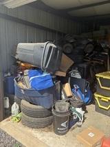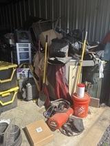 This unit appears to contain…Tires, totes, boxes, Kids 4 wheeler, Shovel, Rake, Baskets,