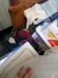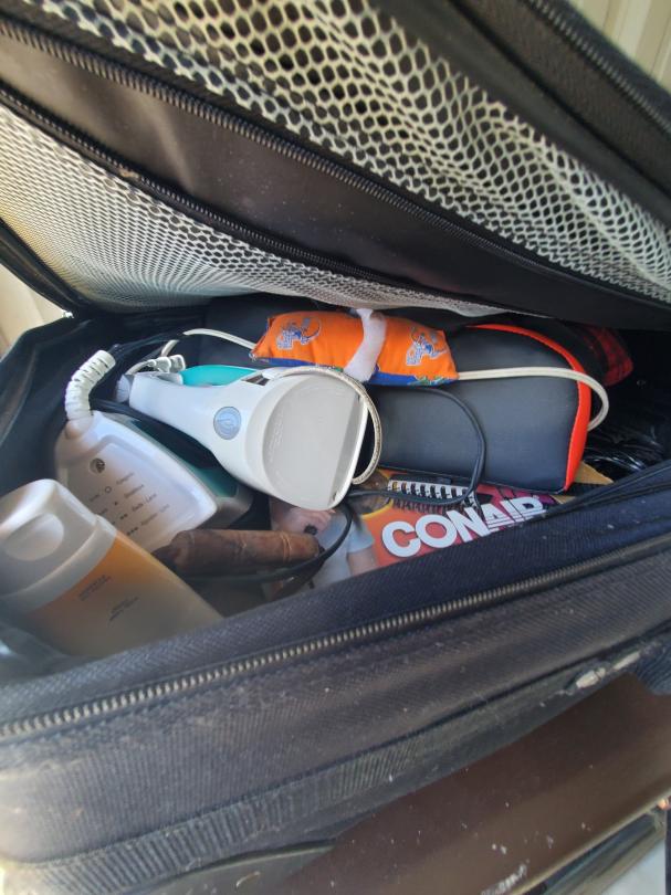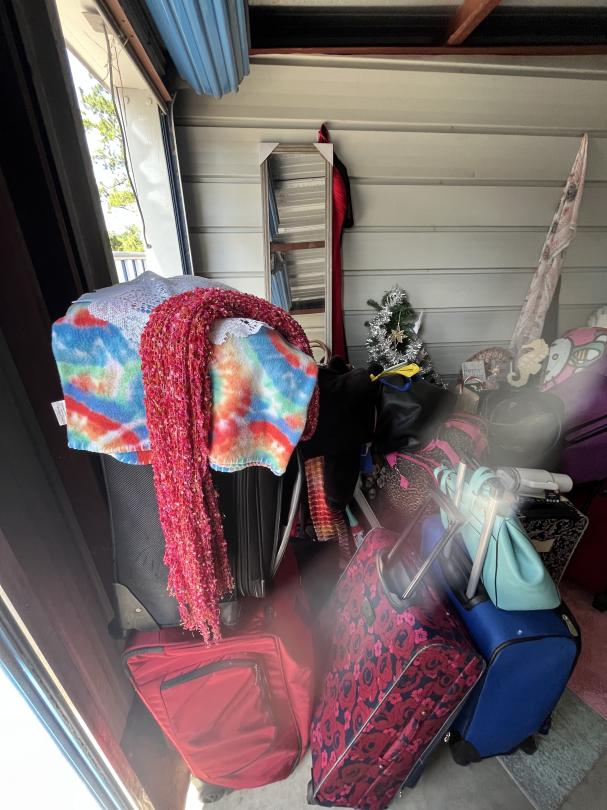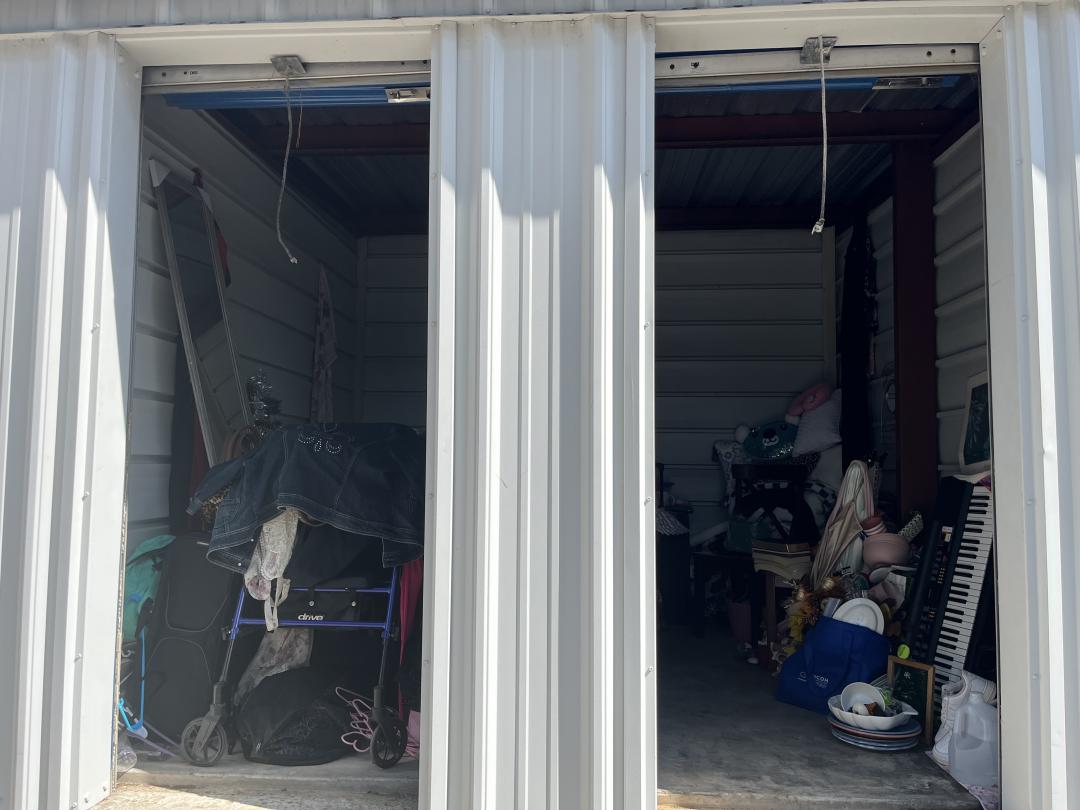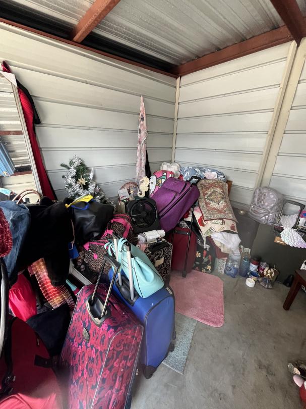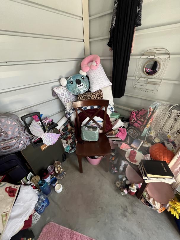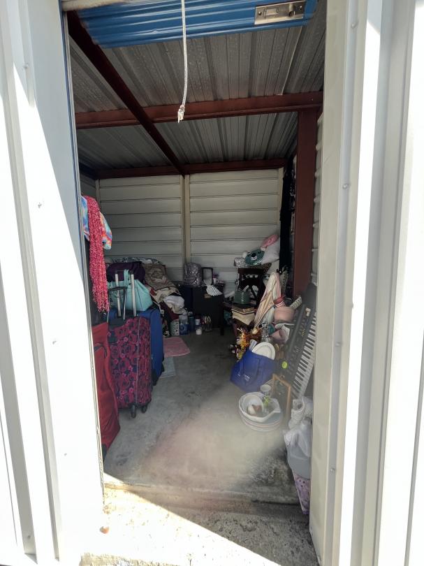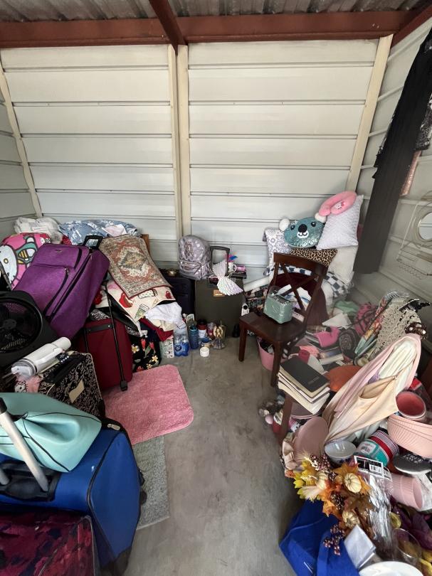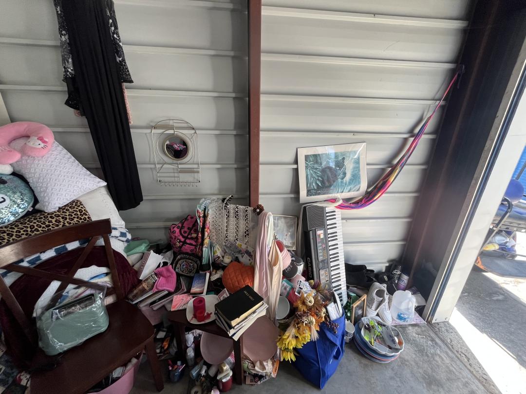 This unit appears to contain…Keyboard, mirror, clothes, suitcases, rugs, fan, pillows, chair, dishes, shoes, Christmas tree