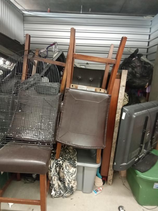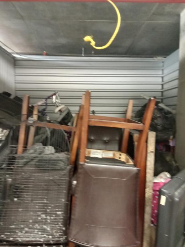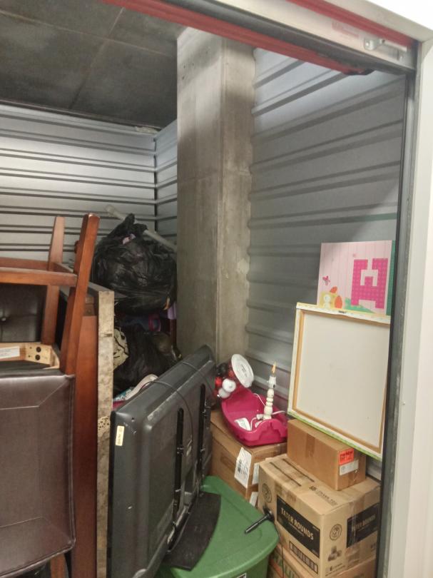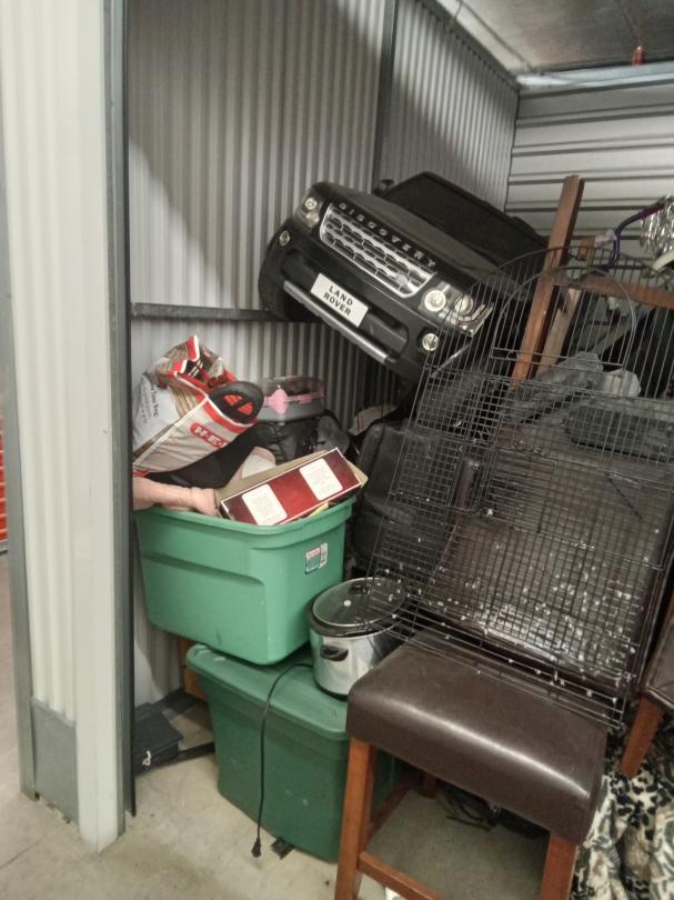 This unit appears to contain…TV, TOTES, CHAIRS, BLANKETS, BAGS, CHILD'S BIKE, CHILD ELECTRIC CAR, SLOW-COOKER, BOXES, WALL ART,
