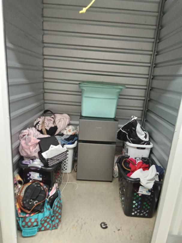 This unit appears to contain…MINI FRIDGE, LAUNDRY BASKETS, BAGS, CLOTHES, TOTES