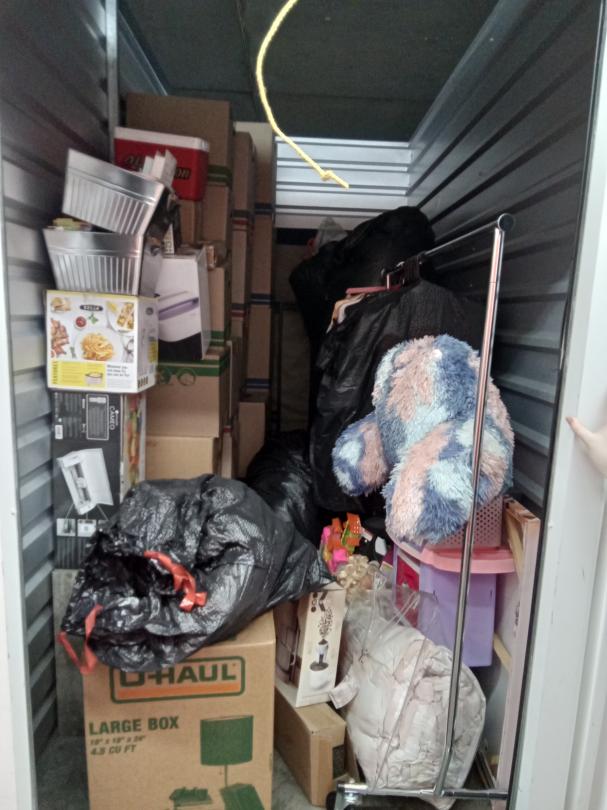 This unit appears to contain…BOXES, PILLOW, CLOTHING RACK, BAGS, METAL BINS, ICE CHEST, BEDDING, CLOTHES