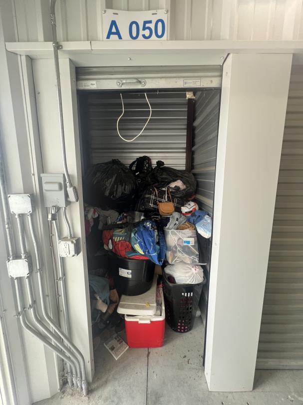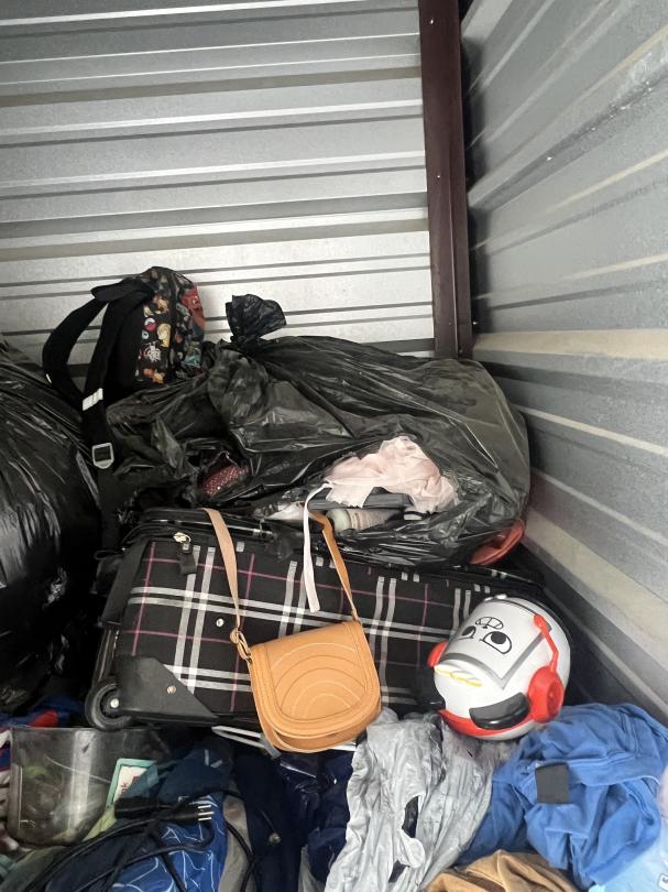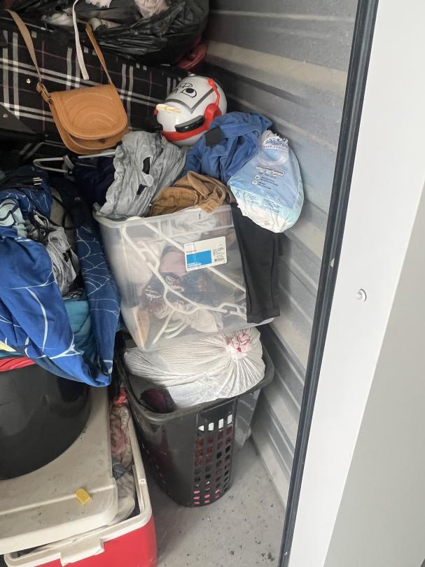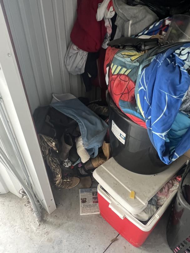 This unit appears to contain…boxes, bins, bags, cooler, clothes, shoes, boots