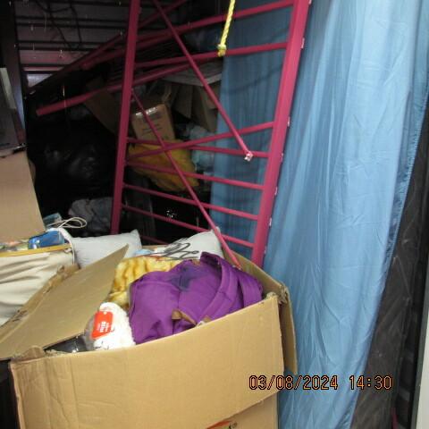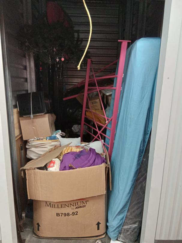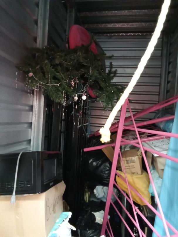 This unit appears to contain…MATTRESS, BED FRAME, BOXES, ARTIFICIAL CHRISTMAS TREE, MICROWAVE, BAGS, TOTES,