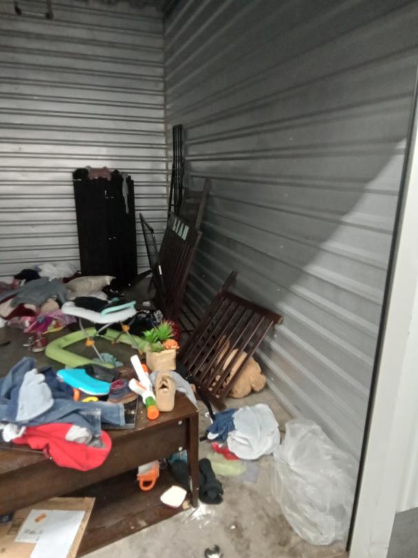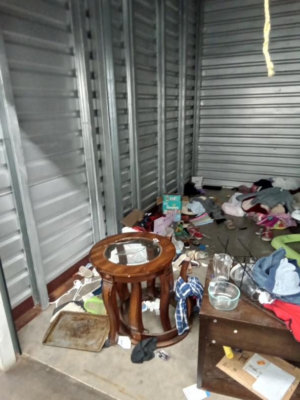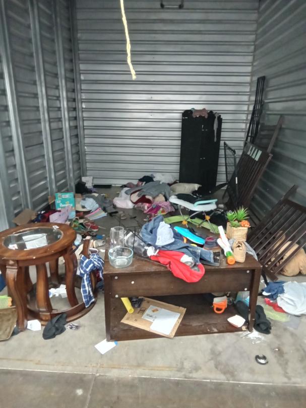 This unit appears to contain…BOXES, PLASTIC STORAGE BINS, MOTORIZED WHEELCHAIR, CHAIRS, TOOL BOX, TV STAND, TABLE