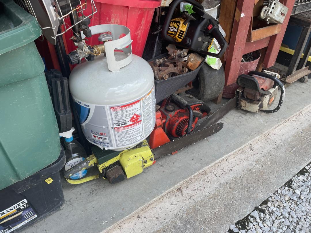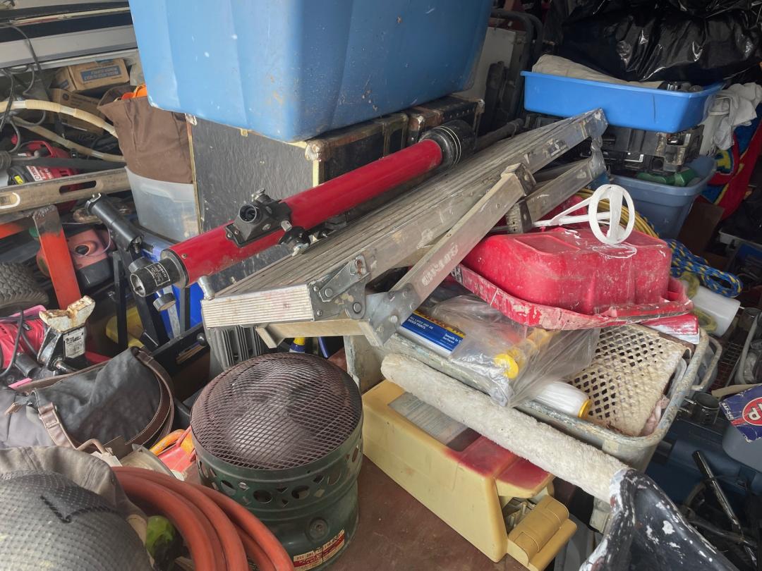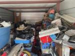 This unit appears to contain…Tool Box, Tools, Power Tools, Lamp, Decor, Plastic Bags, Plastic Containers, Misc. Boxes, Misc. Items, Fishing Pole, guitar amp, guitar, camping gear, fan, telescope, motorcycle helmet, Vehicles not included in Sale