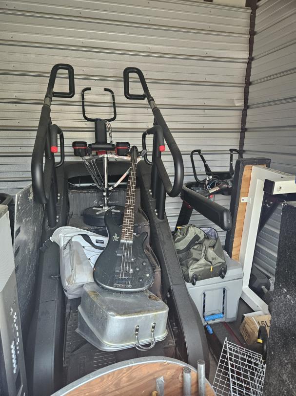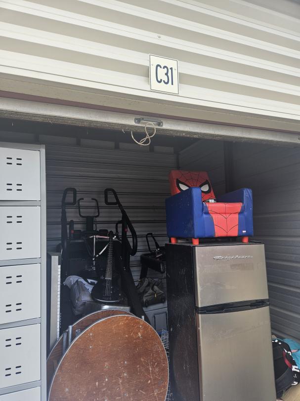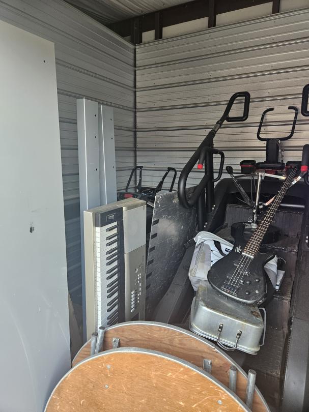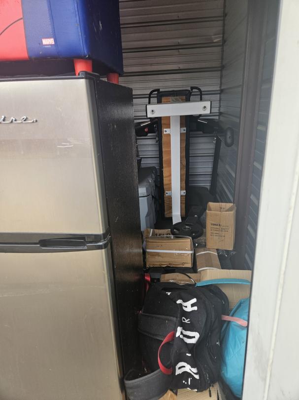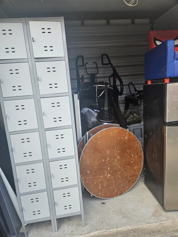 This unit appears to contain…Workout equipment, guitar, small refrigerator, Lockers,