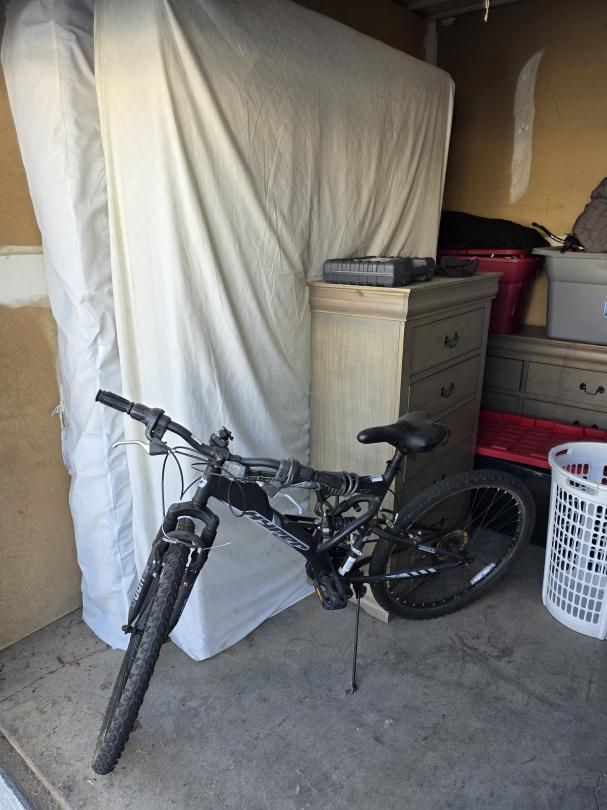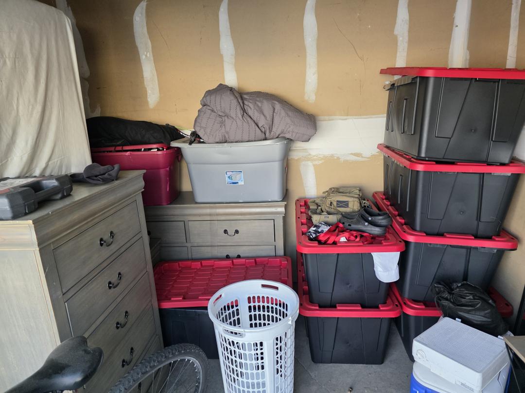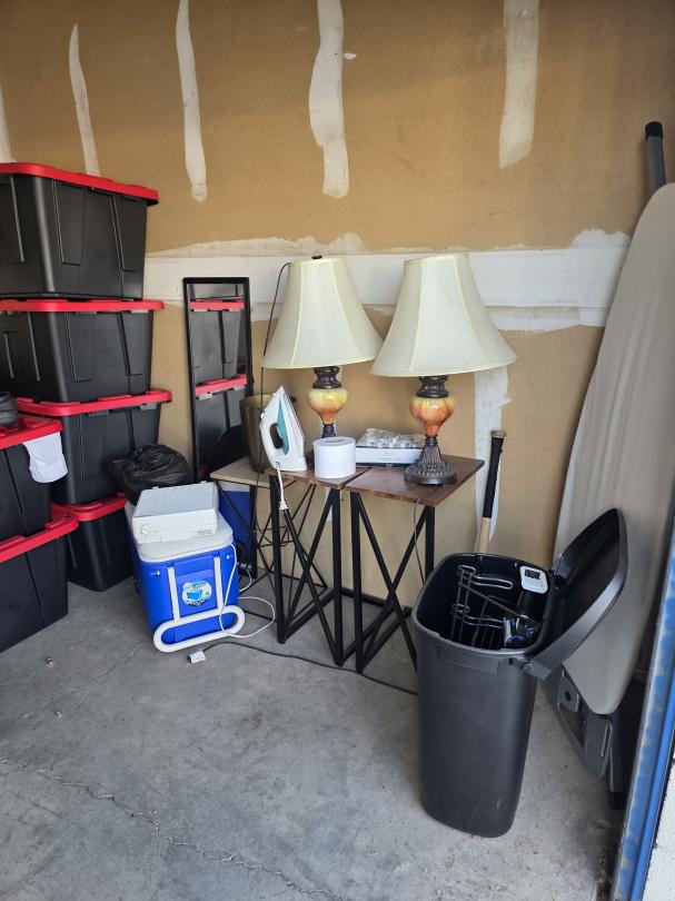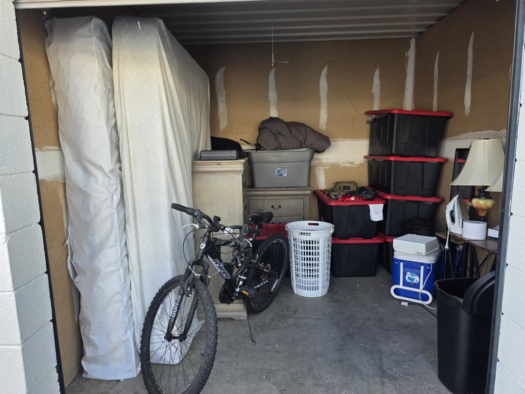 This unit appears to contain…totes, bike, lamps, dressers, ironing board and misc items