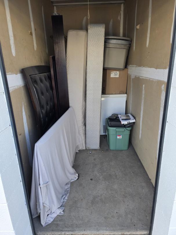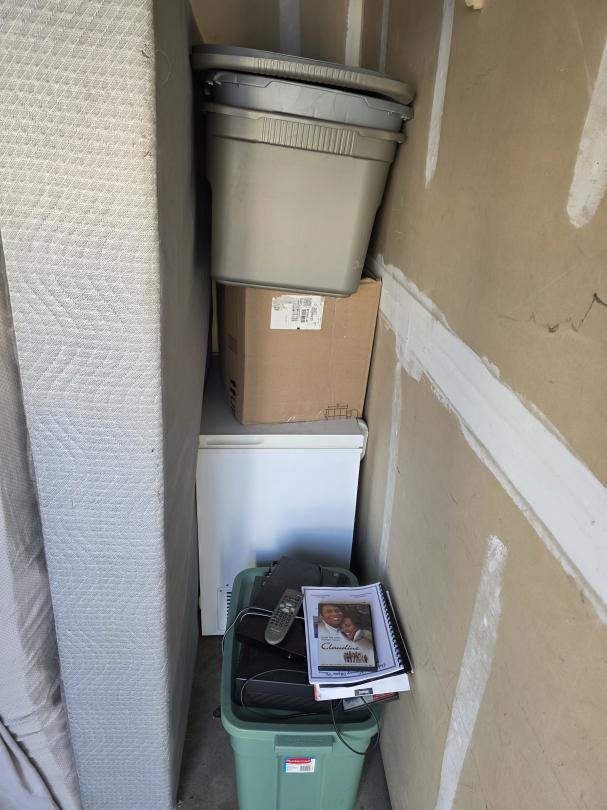 This unit appears to contain…totes, deep freezer, bed and misc items