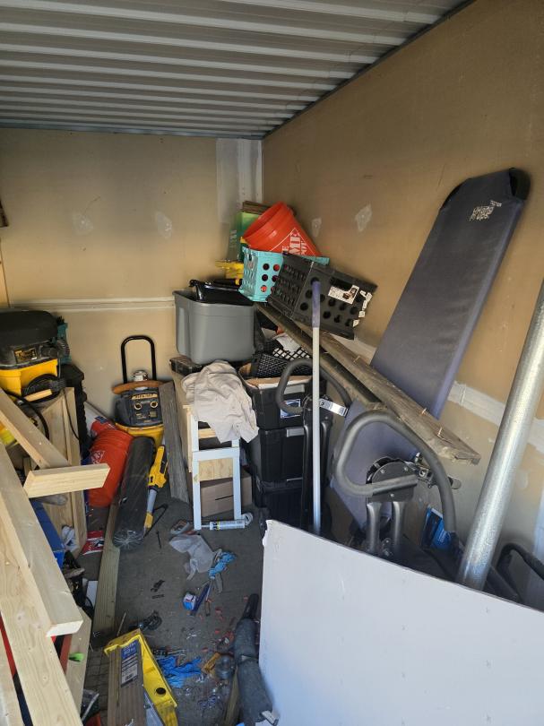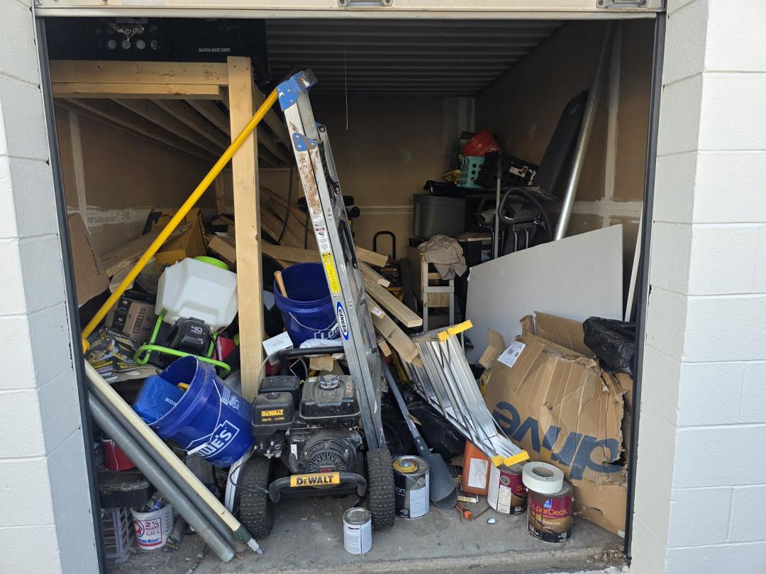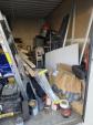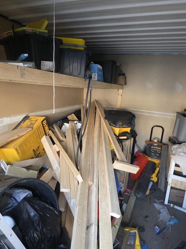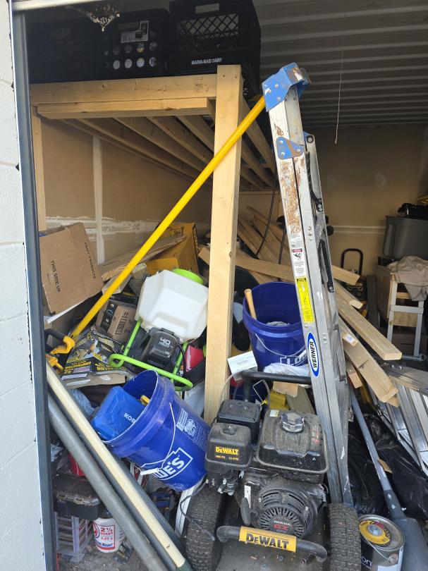 This unit appears to contain…wood, shelving, tools, ladder, tote and misc items