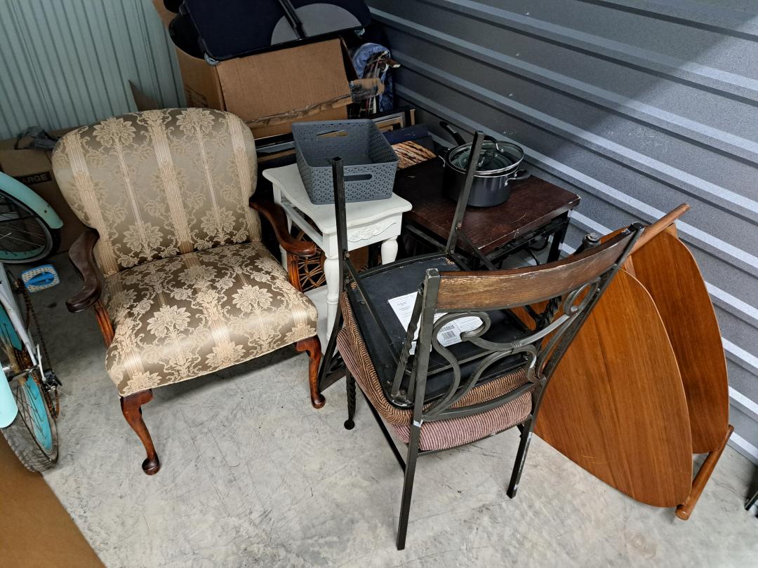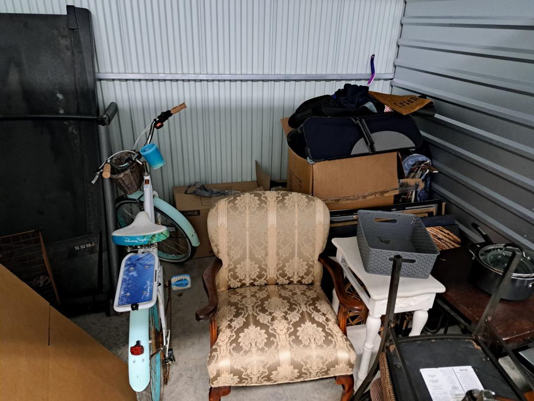 This unit appears to contain…Furniture, chairs, bike, household goods, tables, misc.