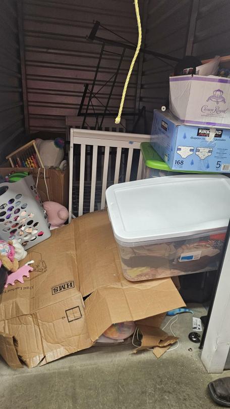 This unit appears to contain…TOTES, TOYS, CLOTHES, BOXES, CRIB, LAUNDRY BASKET