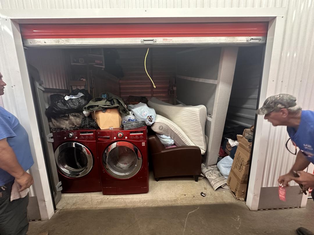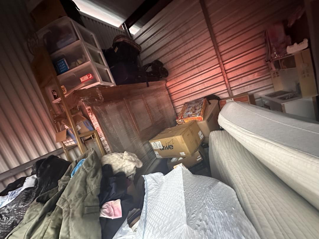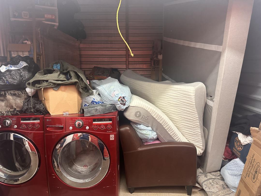 This unit appears to contain…LG FRONT LOADING WASHER AND DRYER, COUCH, MATTRESS AND BOXSPRING, BOXES, CLOTHES, BAGS, FURNTIRE, STORAGE DRAWERS