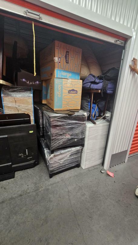 This unit appears to contain…BOXES, COUCH, FURNITURE, SHELVES, BAGS, WASHER, TV