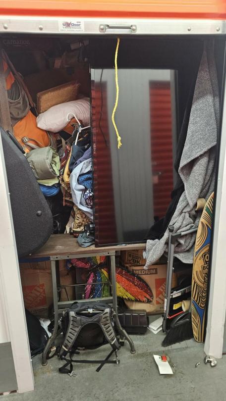 This unit appears to contain…SKATEBOARD, BACKPACK, BOXES, BLANKET, FURNITURE, TV, CLOTHING, BAGS