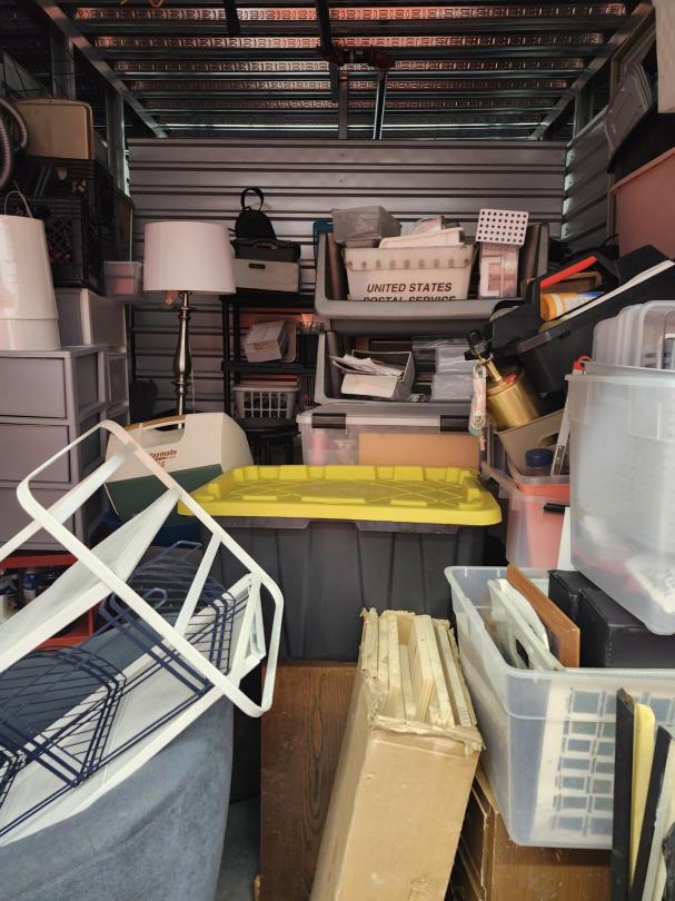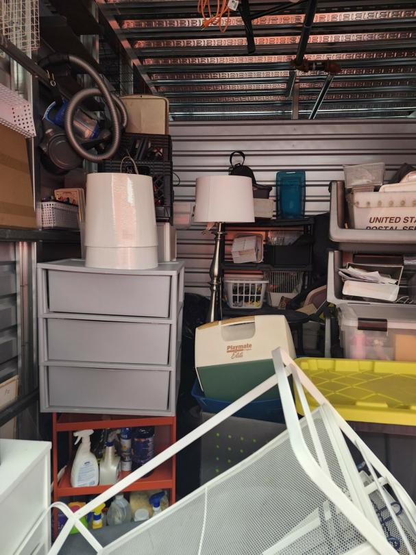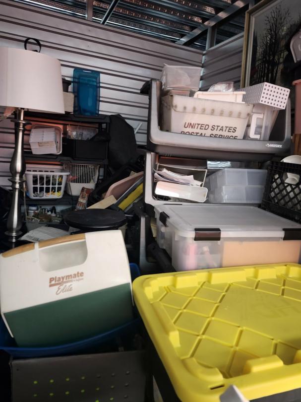 This unit appears to contain…TOTES, BOXES, FURNITURE, SHELVES, CHAIRS, DRESSER, LAMP SHADES, WOOD, BASKETS, LAMP