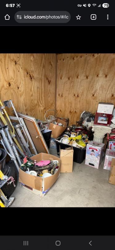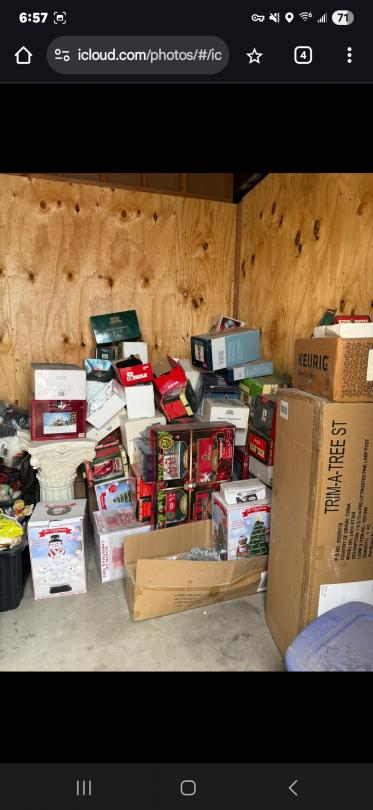 This unit appears to contain…BOXES, CHRISTMAS DECORATIONS, TOTES, HOME DECOR, USED TIRE