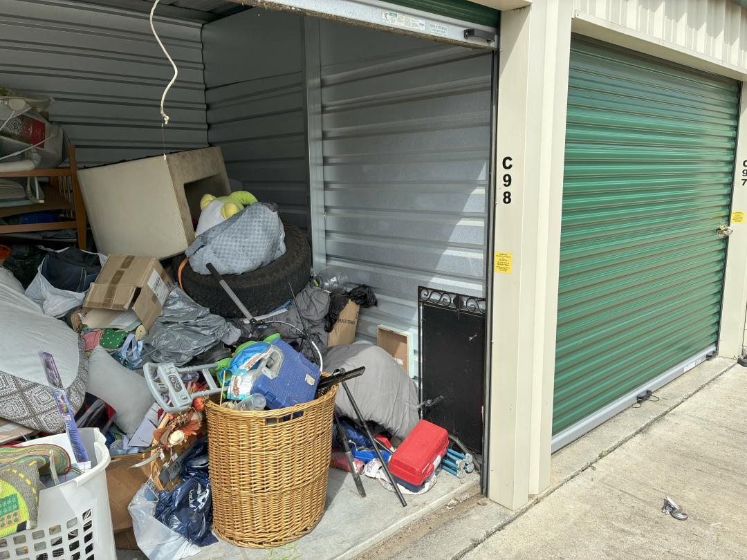 This unit appears to contain…This unit appears to have some baby furniture and gear, fishing poles and gear, as well as some home decor and more.