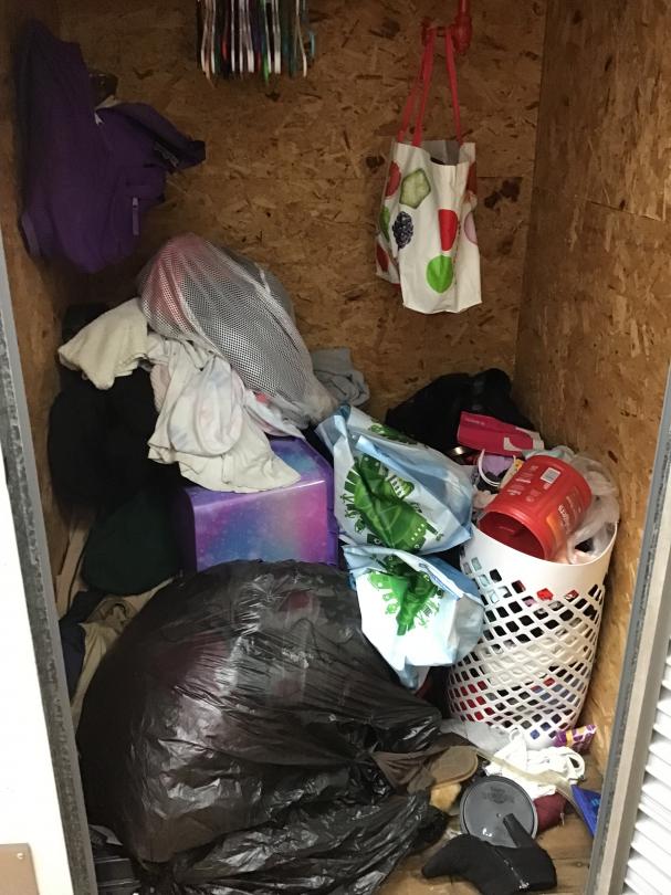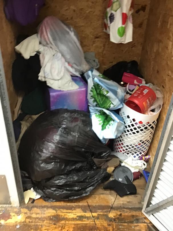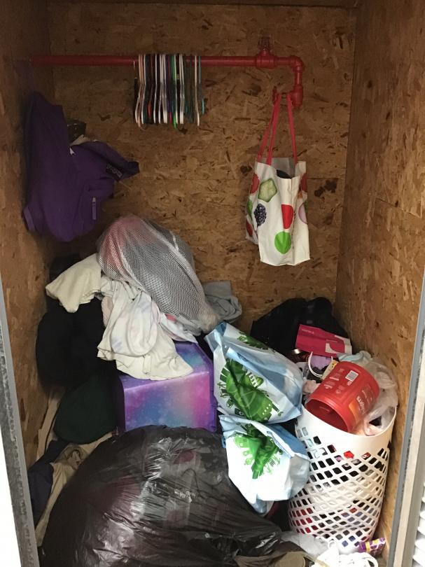 This unit appears to contain…4x4x6 Lockers Lower Level Lower Level Heated. Unit appears to contain assorted clothes, backpack, shoes, laundry basket, bags, and hangers.