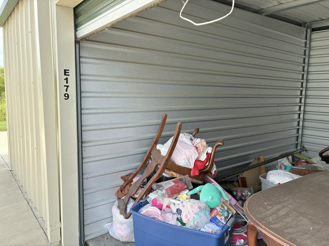 This unit appears to contain…This unit appears to contain a dining room table and chairs, baby clothes and gear, a headboard and footboard, Christmas decor, and more.