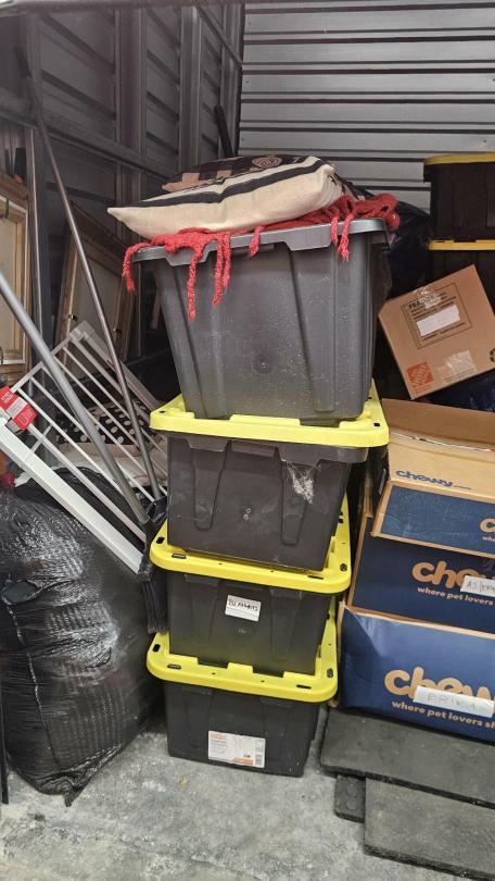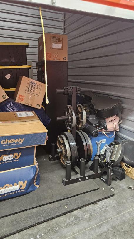 This unit appears to contain…TOTES, BOXES, GUITAR CASE, WEIGHT RACK WITH WEIGHTS, METAL CABINET, BAGS, PILLOWS