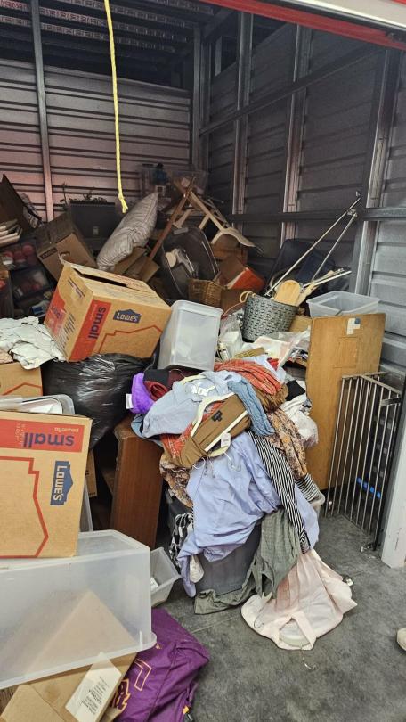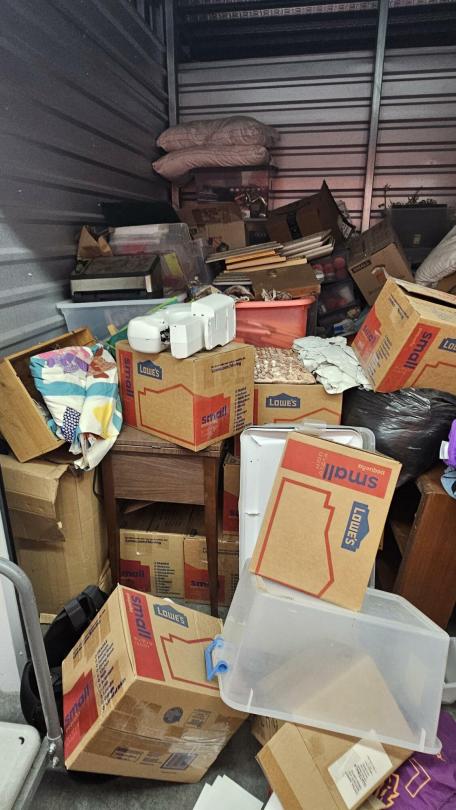 This unit appears to contain…PLASTIC BINS, PLASTIC ORGANIZERS, BOXES, CLOTHING, FURNITURE BASKETS, TOTES, CHAIR, SHELVES