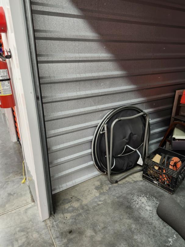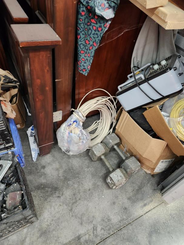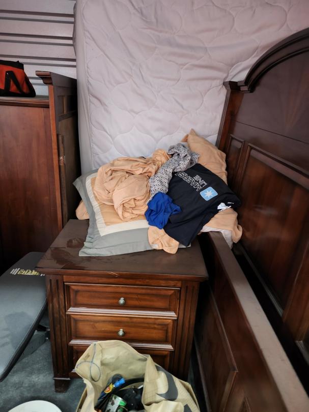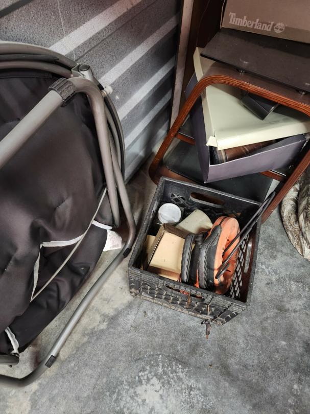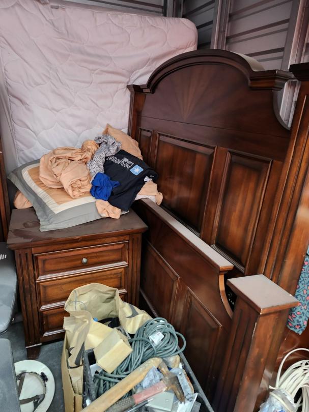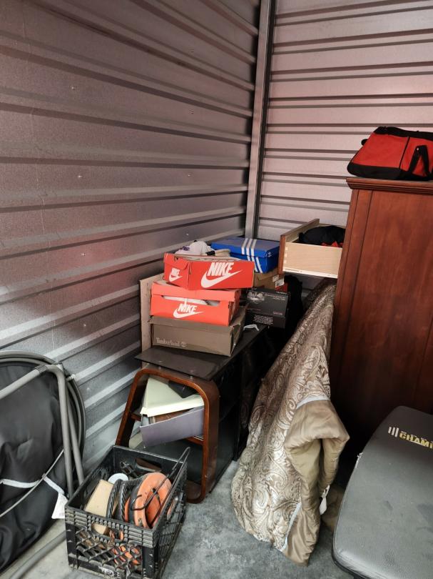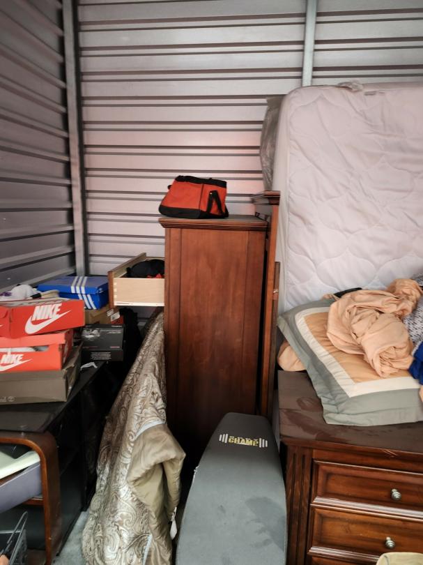 This unit appears to contain…FURNITURE, PLASTIC CRATES, MATTRESS, BEDDING, BLANKET, SHOES, SHOE BOXES, CHAIR, WOODEN BED FRAME, NIGHTSTAND, WEIGHT BENCH, BAGS