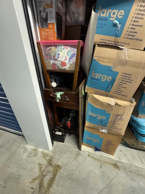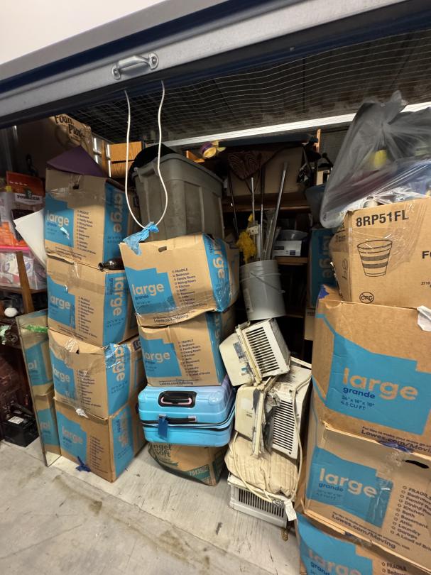 This unit appears to contain…Appears to have boxes, totes, ac , tables