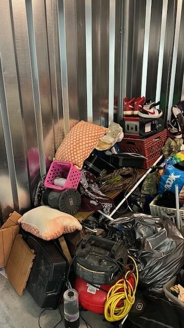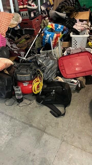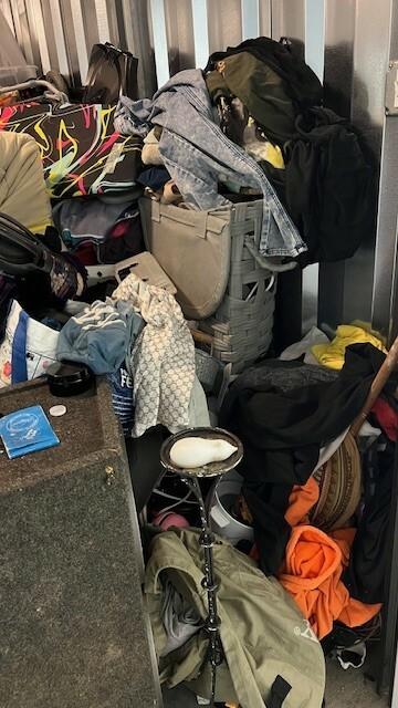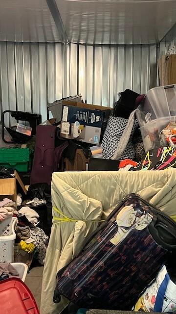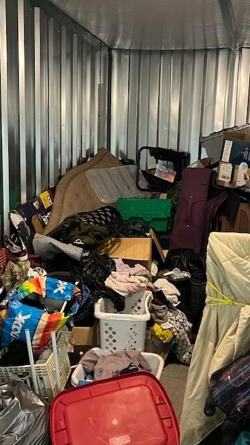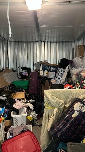 This unit appears to contain… TV,Chairs,Plastic Bags,Plastic Containers,Misc. Boxes,Clothing,Misc. Items,Suitcases,Bookbags