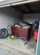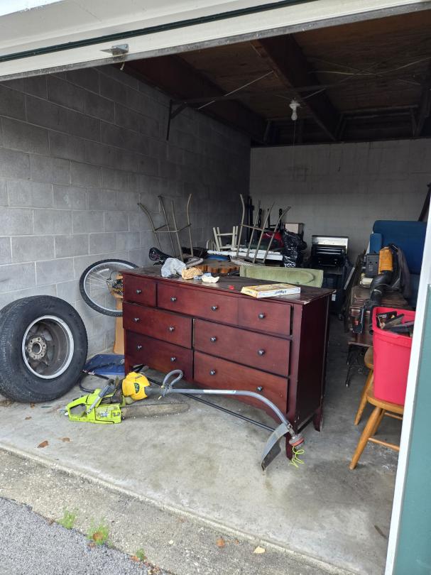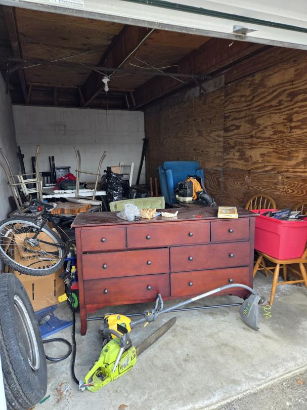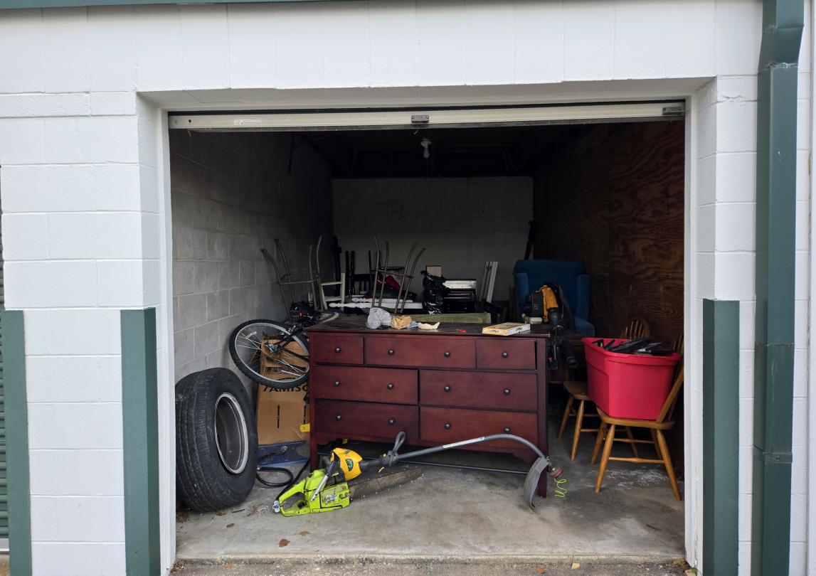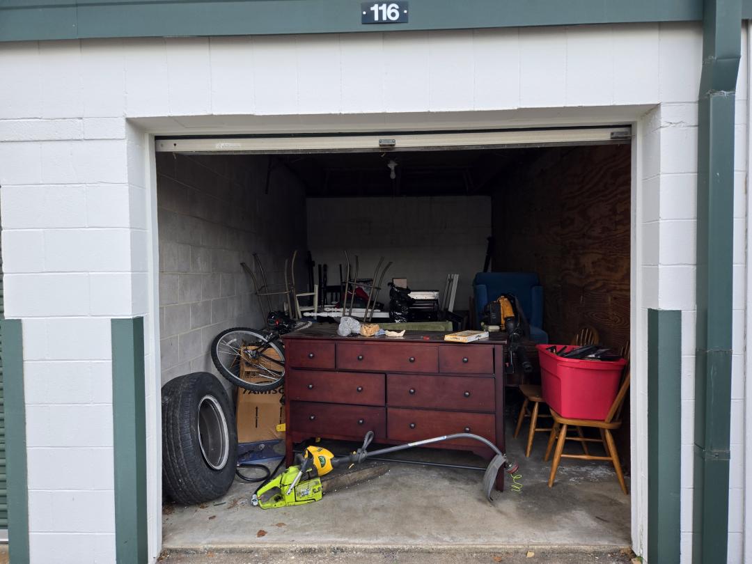 This unit appears to contain…Chaninsaw, leaf blower backpack-style gas-powered model, weedwacker, bike, dresser, chairs, tables, totes, boxes, DVDs, woodwork, tire, kids trike