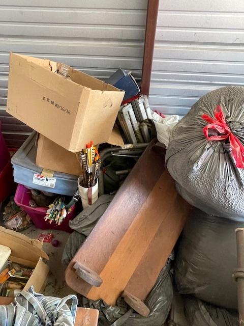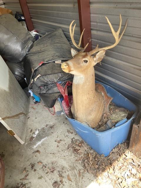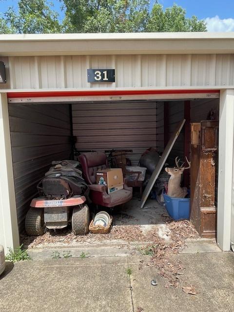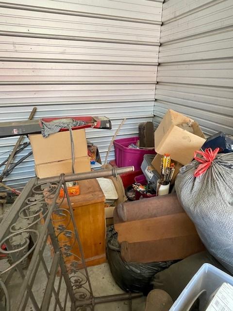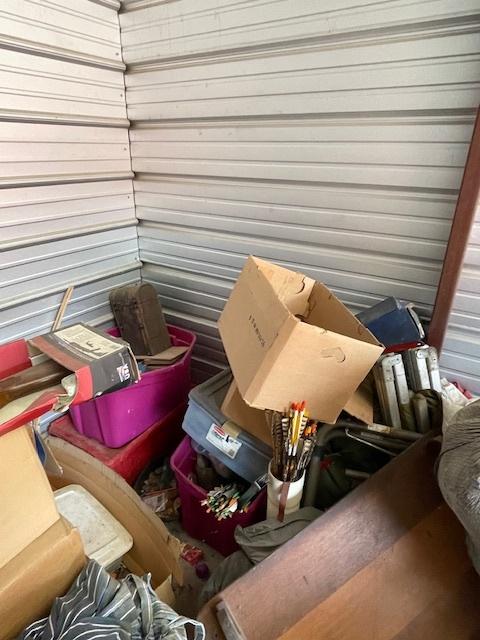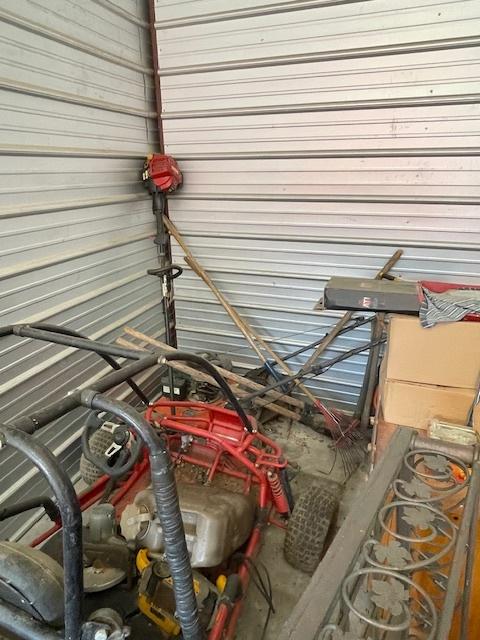 This unit appears to contain…Go Cart, riding lawn mower, Grandfather Clock, arrows, deer head, military cot, iron coffee table, boxes