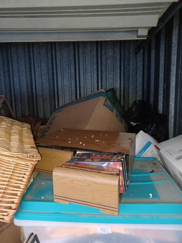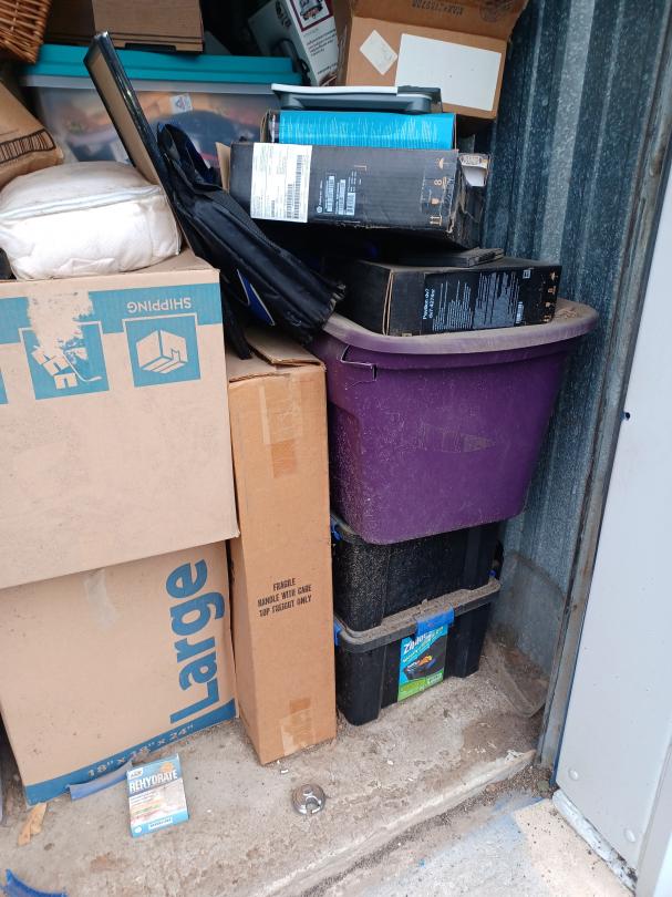 This unit appears to contain…Totes, boxes, dishes, bedding, clothes, rug, Christmas decor, pictures, DVD's