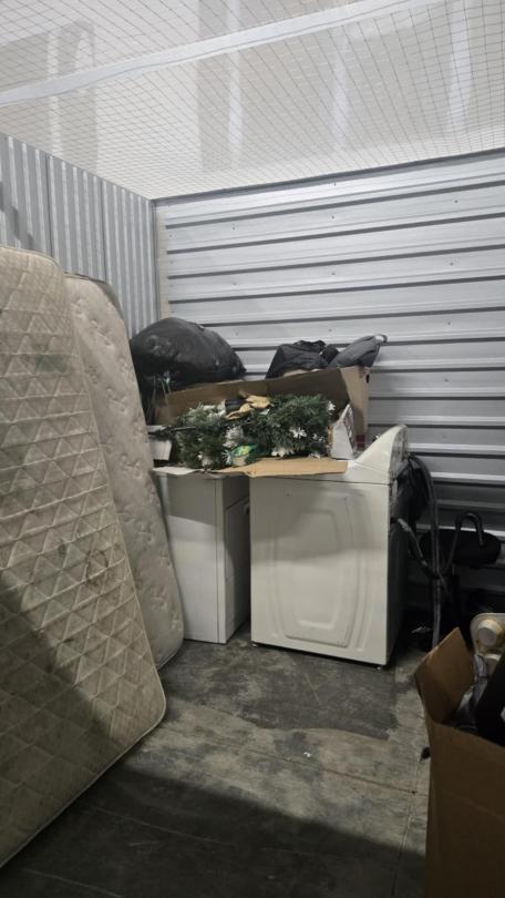 This unit appears to contain…Washing Machine,Dryer,Mattresses,Misc. Items