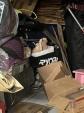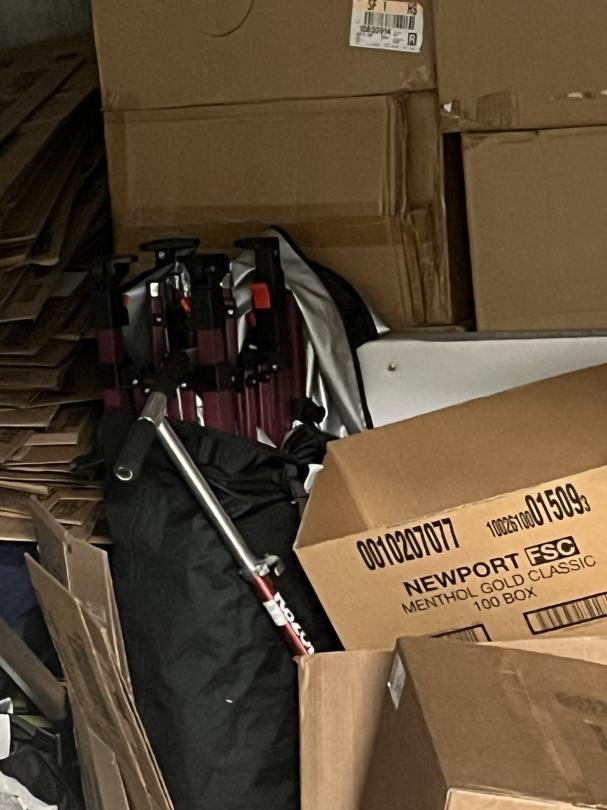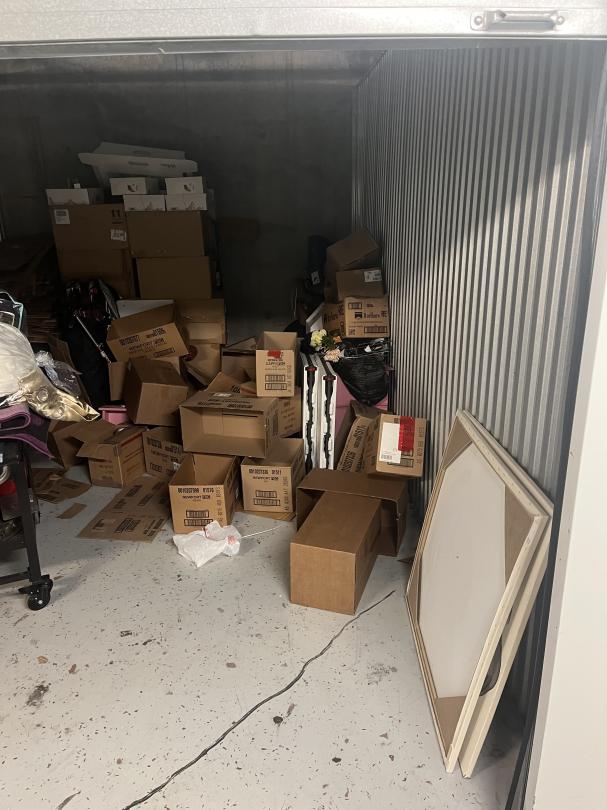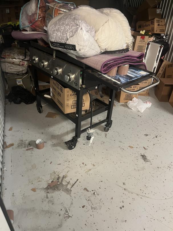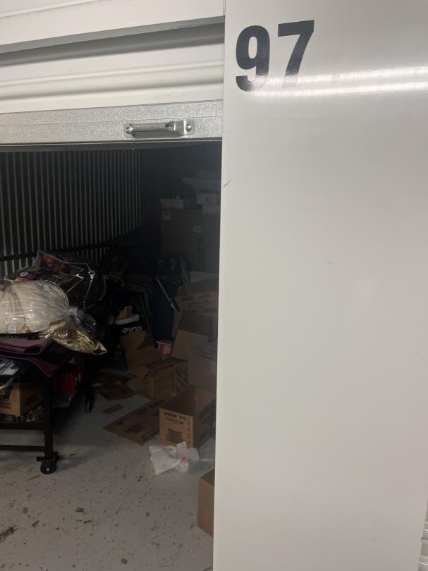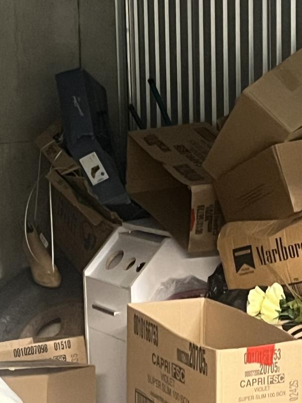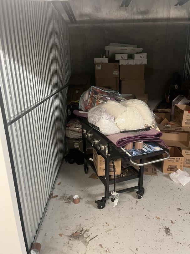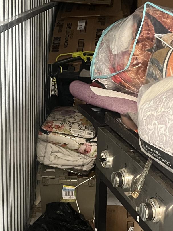 This unit appears to contain…boxes, totes, tent , cloths, lawn mower, flat top grill, bedding, shoes