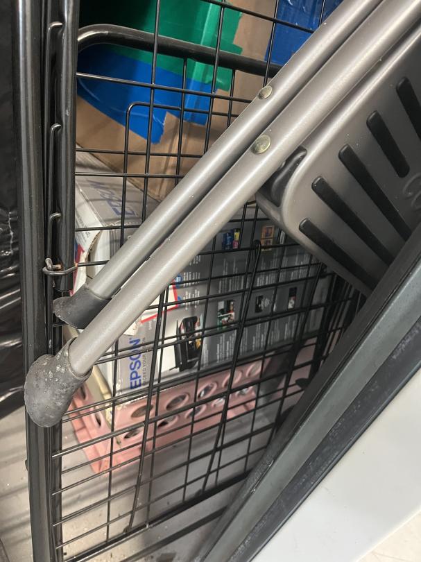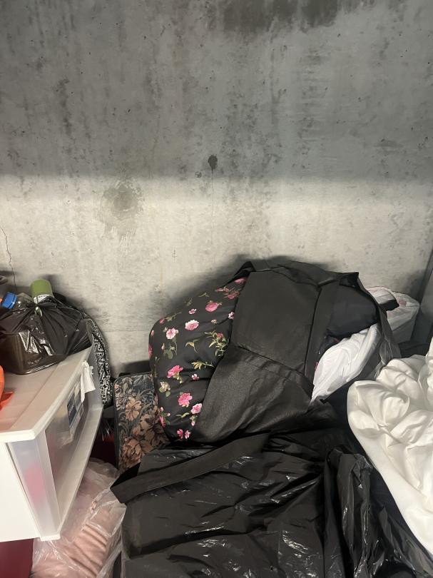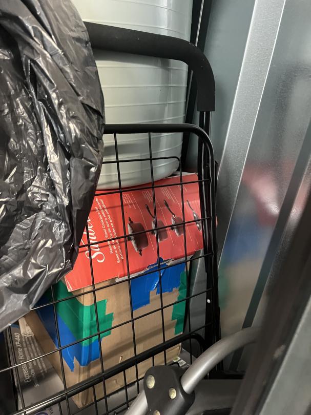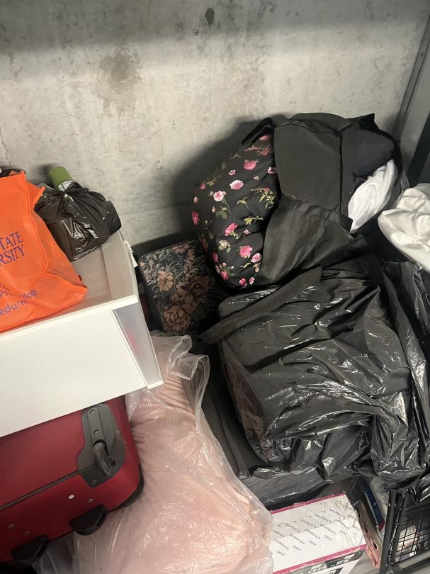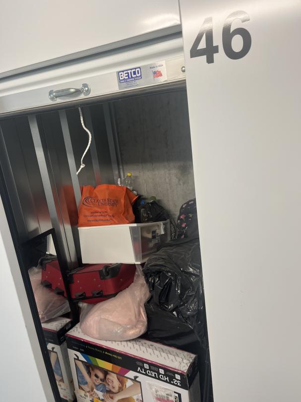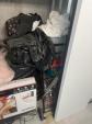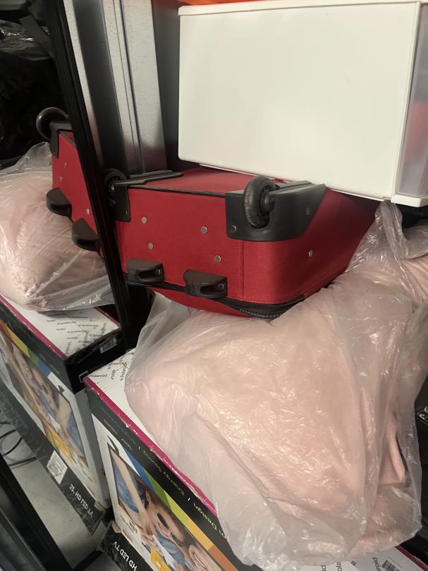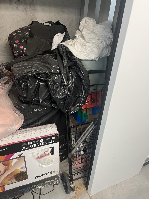 This unit appears to contain…suit case bags, carts purse, cloths, shoes, tv, totes