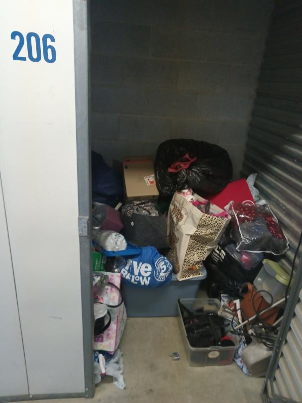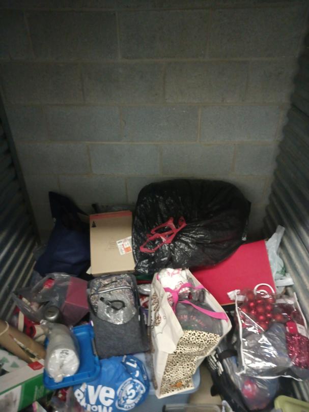 This unit appears to contain…This ground level 5x5 appears to contain : Bags, Totes, Boxes, Holiday Decor, tools, Work Light, Wrapping Paper, Misc. Household Items.