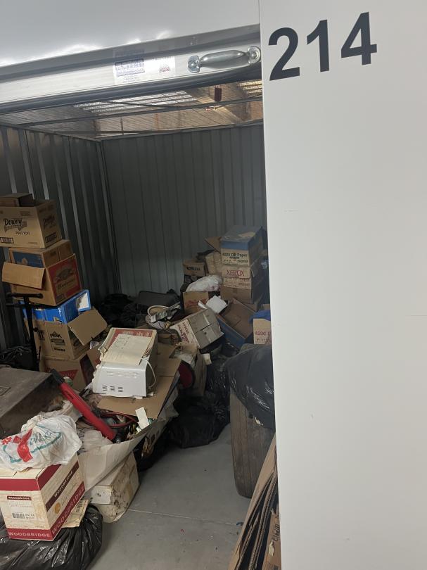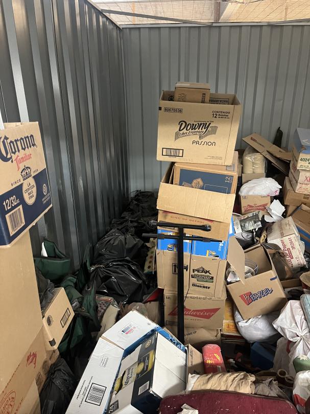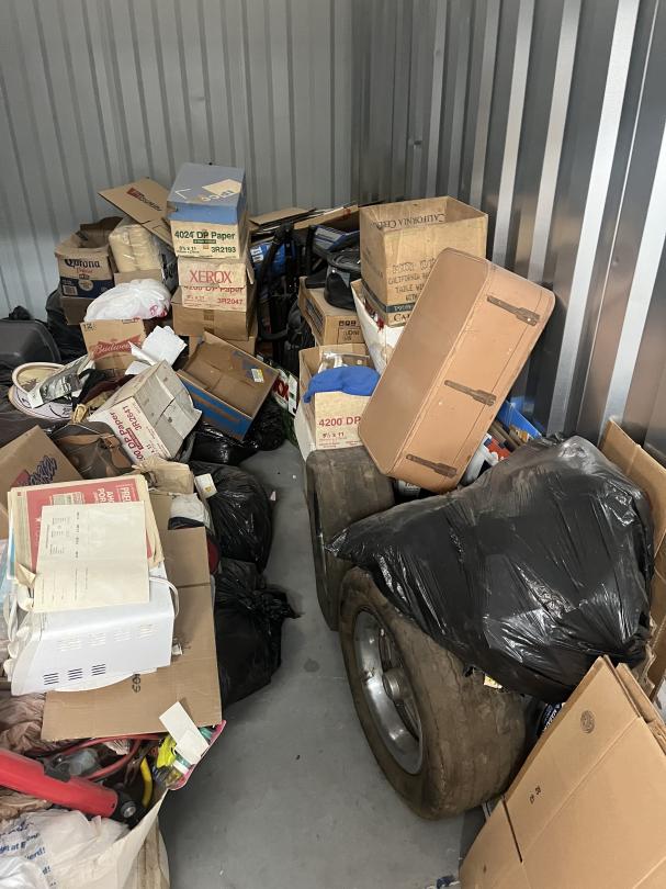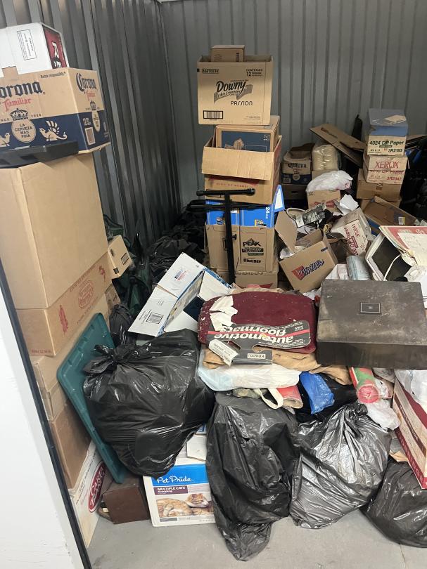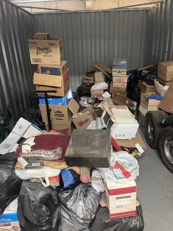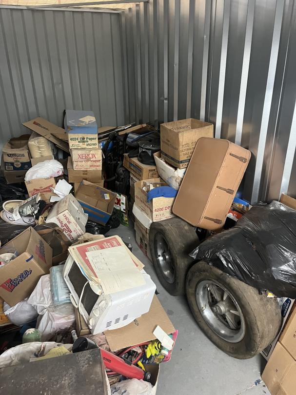 This unit appears to contain…boxes, clothes shoes, totes, bags, suitcase tools, tires