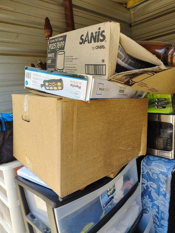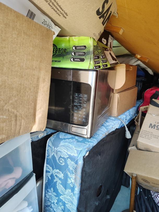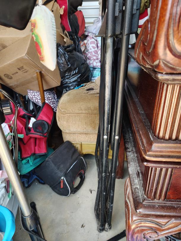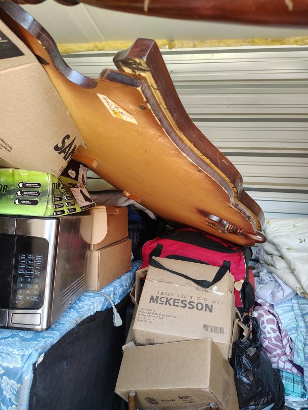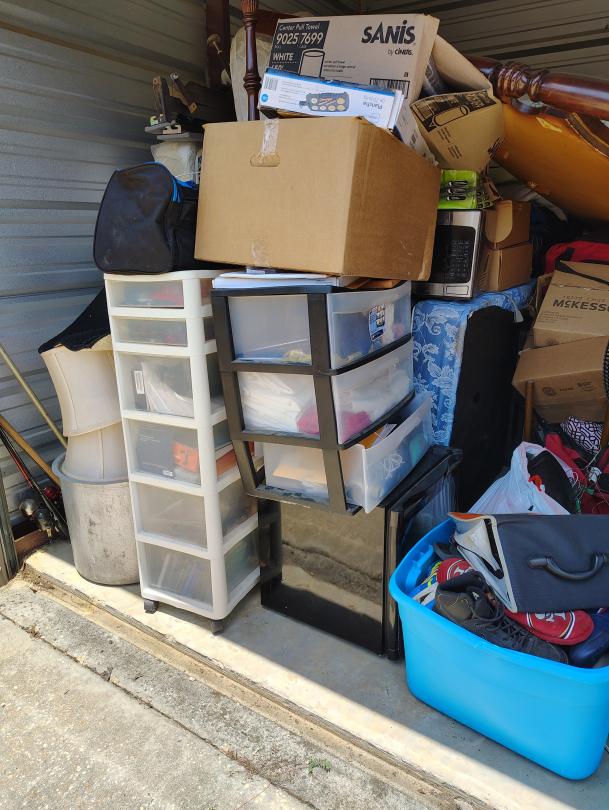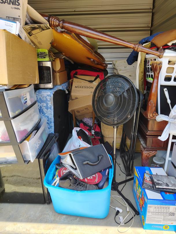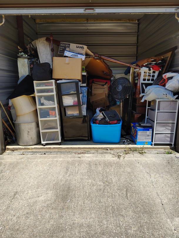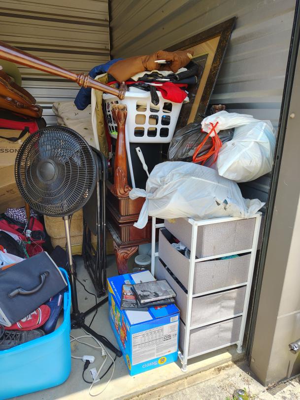 This unit appears to contain…This unit appears to have a standing fan, a mini fridge, a crawfish pot, possible shelves, bags, fishing poles, a lunch box, CDs, a stool, foldable chairs, Microwave, framed paintings, end tables, sofa, possible PlayStation, Propane Tank, a rug, a propane tank, Duffle bag.