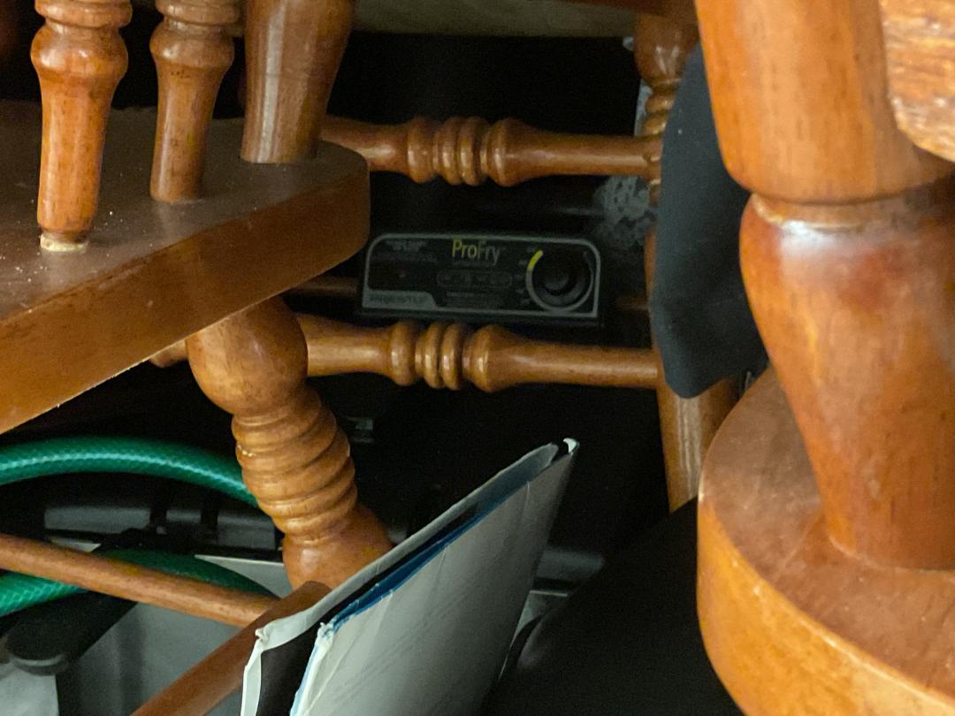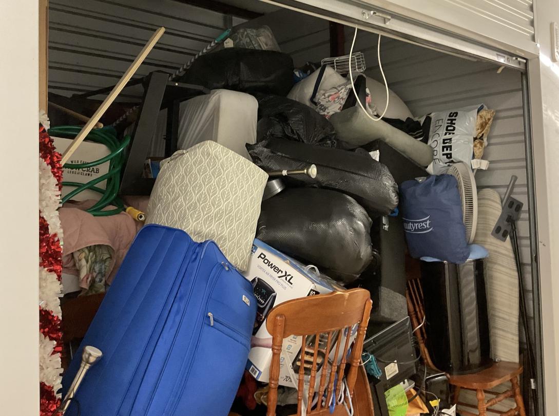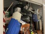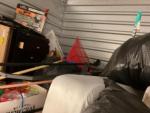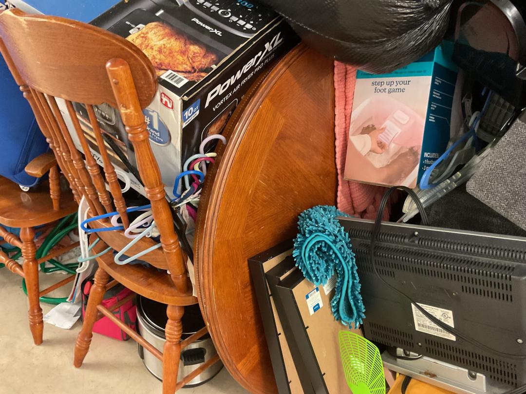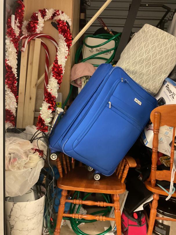 This unit appears to contain…This unit appears to have a Chairs, a Power XL air fryer, Dining room table, a trashcan, luggage, a couch set, bags, Decor, Ironing boards, crock pot, comforter set, hose, small grill, a small tool bag, a toaster, a coffee pot, Christmas decor, rugs, dvd player and perfumes.