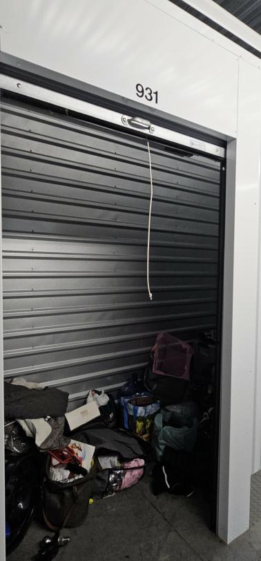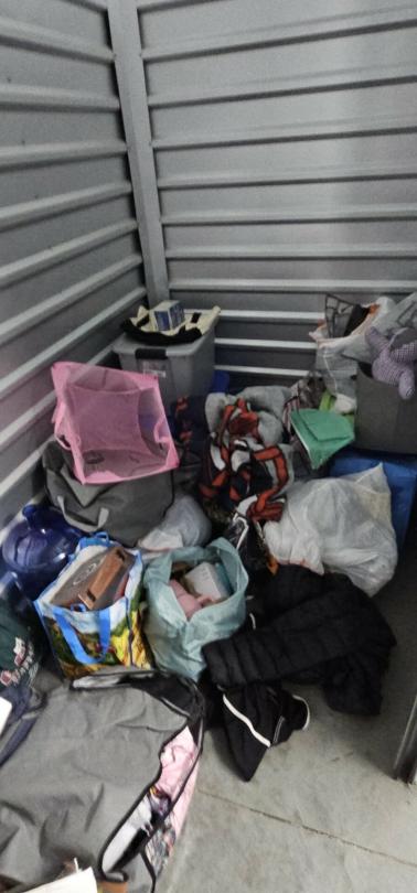 This unit appears to contain…Clothing, Tire rim, shoes, hitch, totes