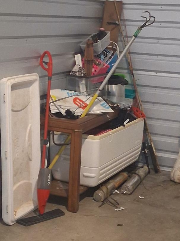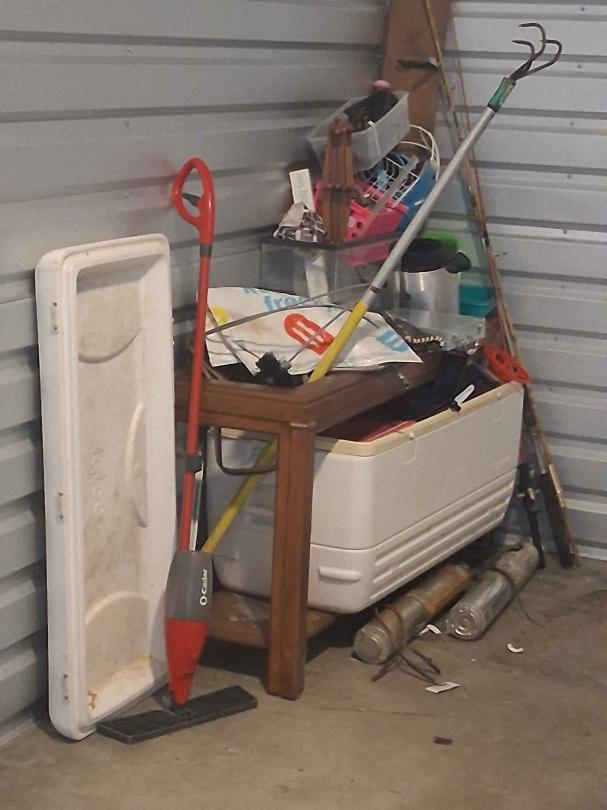 This unit appears to contain…Unit has a cooler, fishing poles, entrance table etc.