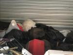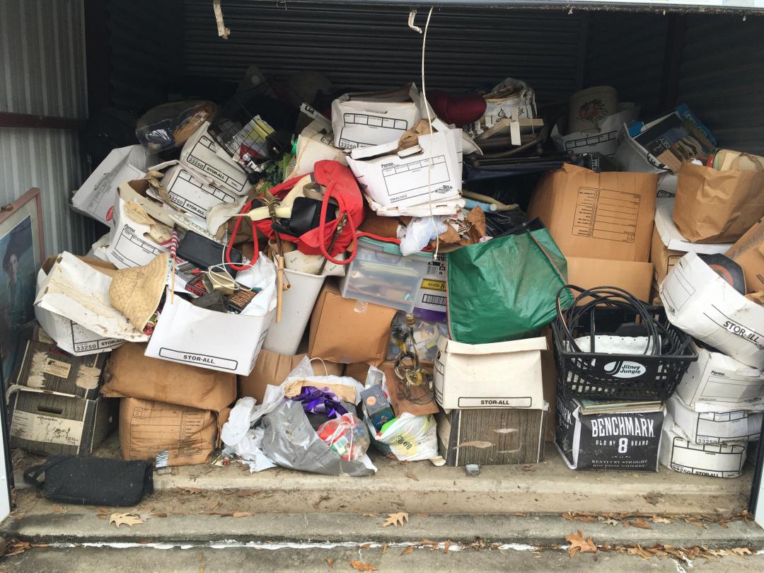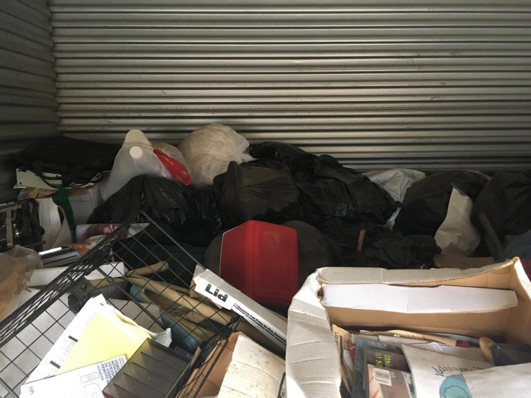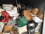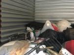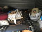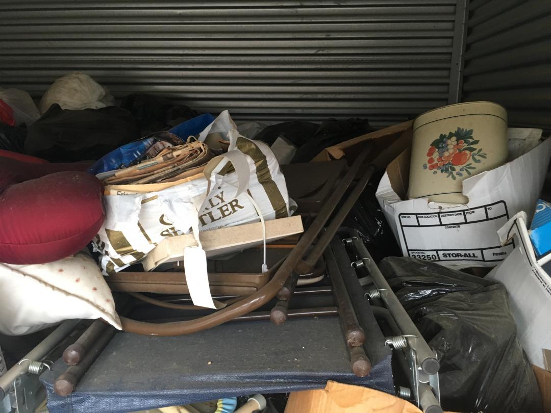 This unit appears to contain…folding cot, folding chair, ice chest, typewriter, wall art, throw pillows, purse, books, lamp, cable, clothes, miscellaneous boxes, miscellaneous bags