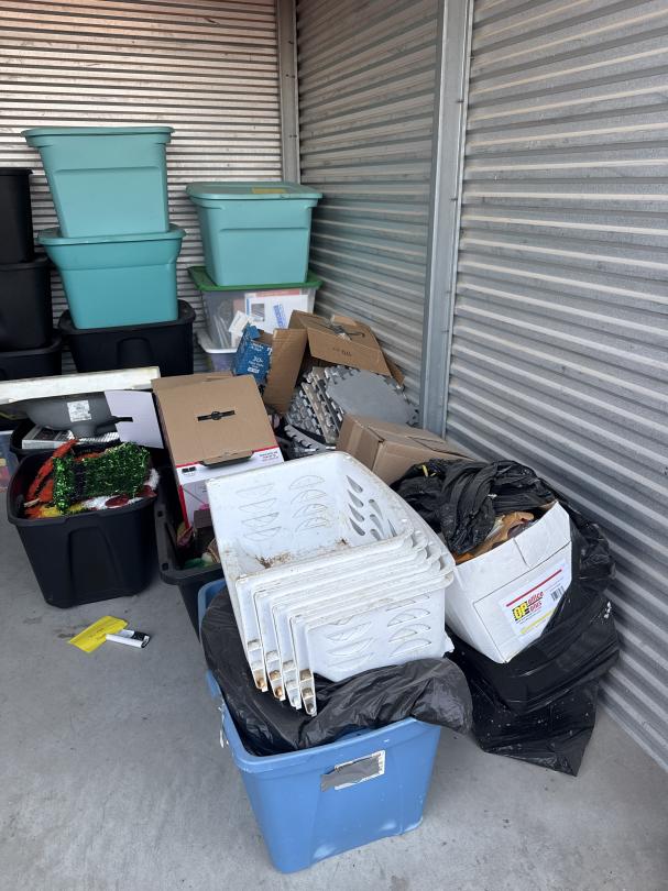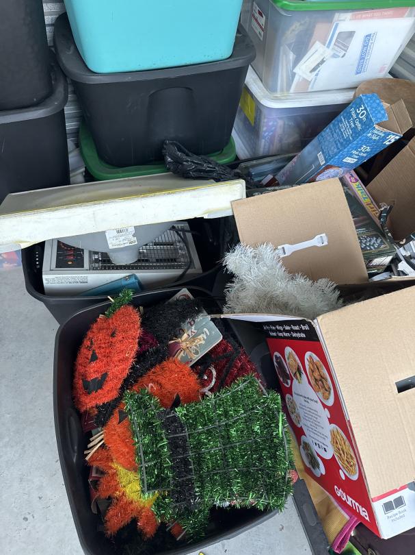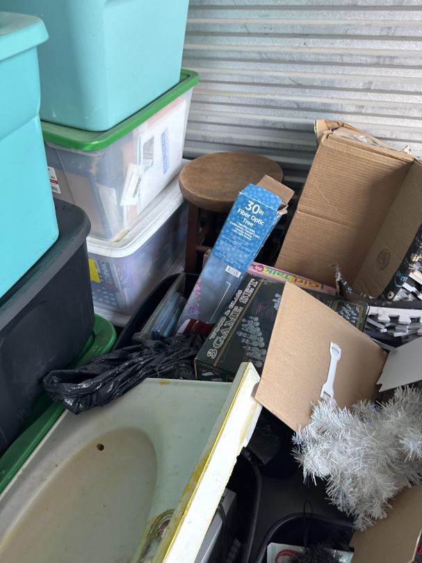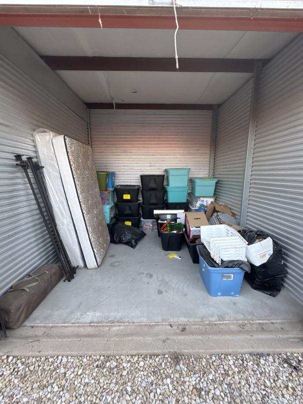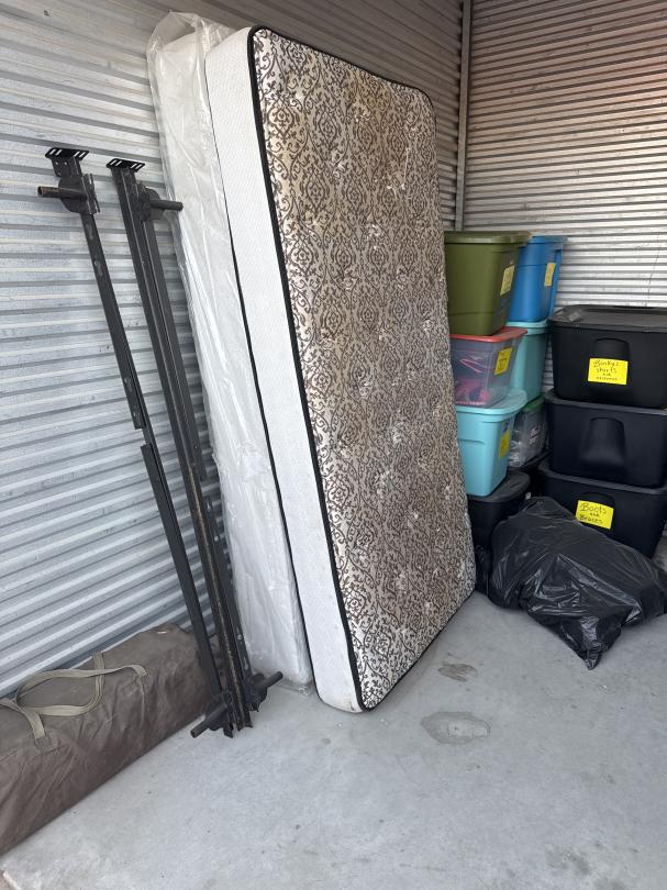 This unit appears to contain…Queen bed, matress and frame, tent, flooring, household items