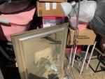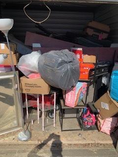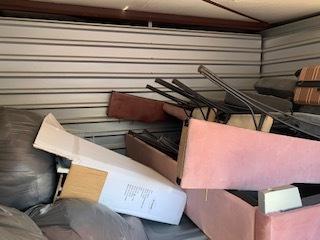 This unit appears to contain…Drive-Up Floor lamp Mirror Academy beach wagon Luggage TV wall mount 2 Corner shelves 4 Chairs Pink bed frame Couch Wall art 2 Pink bar stools Plastic storage drawers (2) 2 End table Floor Rug Misc Totes, boxes, and bags