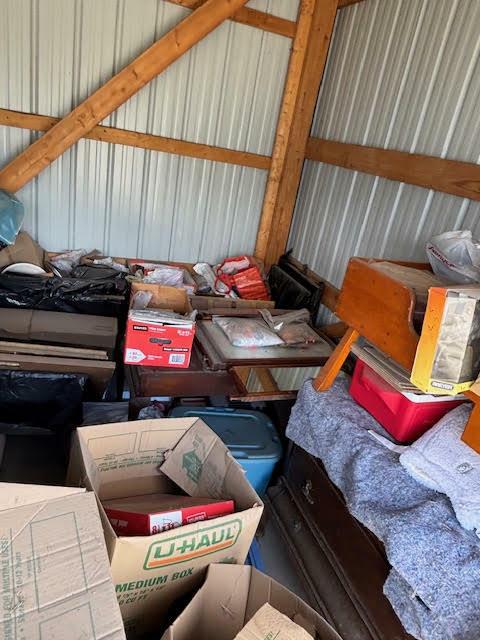 This unit appears to contain…Boxes, totes, lamp, shelves, dresser, etc.