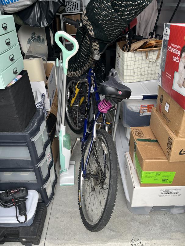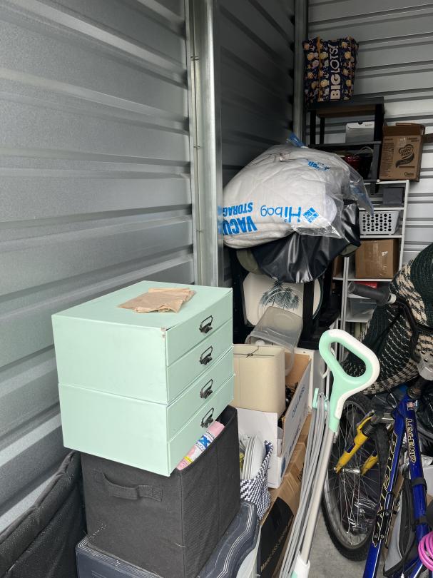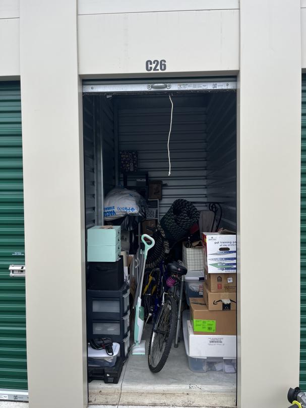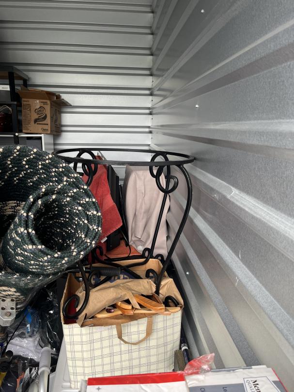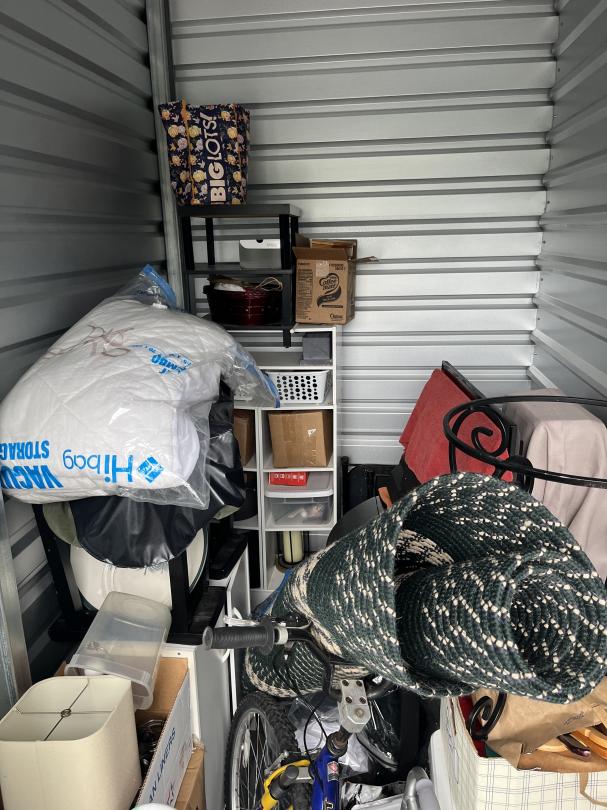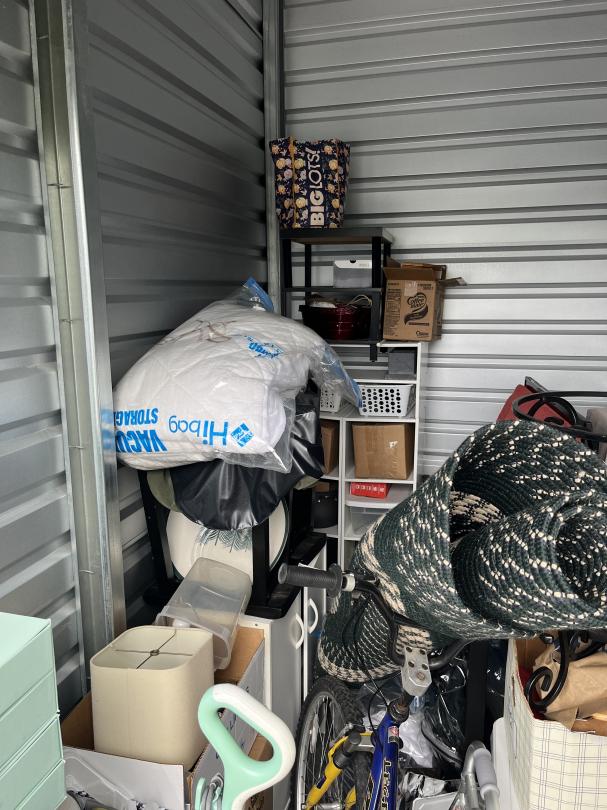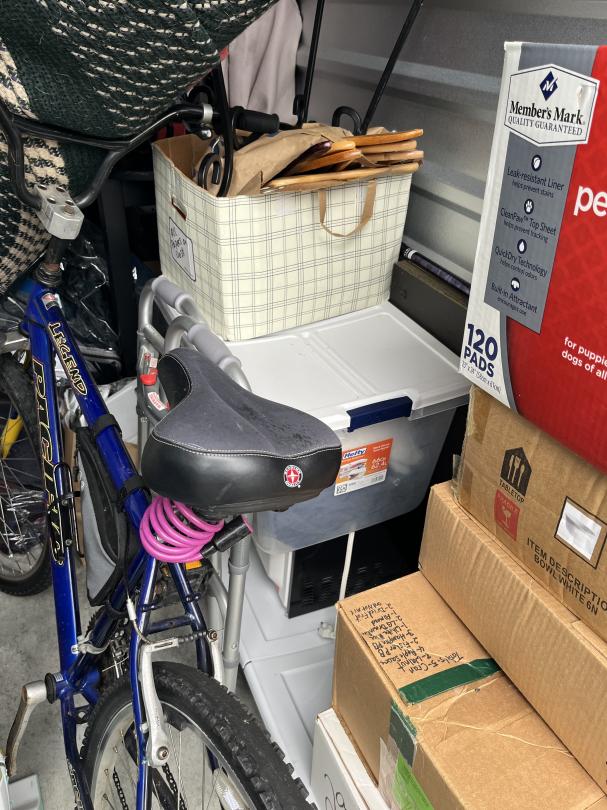 This unit appears to contain…The unit appears to contain a bike, boxes, totes, rug, shelves, table, lamp shade, walker, drill, steam mop and tv/computer monitor.