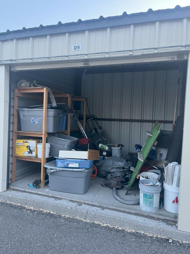 This unit appears to contain…This unit appears to contain a mix of household, outdoor, and construction-related items. Visible contents include storage bins, buckets, an aluminum dolly, a wooden shelving unit, a green decorative shelf, blinds, tarps, hoses, a toolbox, a plastic sled, and other miscellaneous personal property. Contents are based on visual inspection only and are not guaranteed. Additional items may be present. Unit sold as-is.