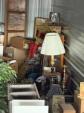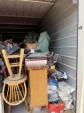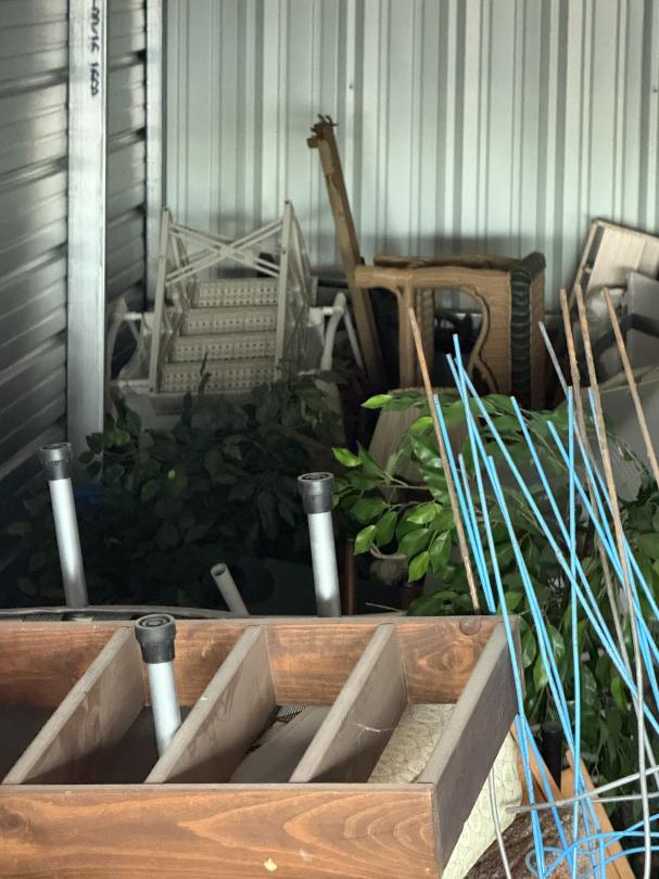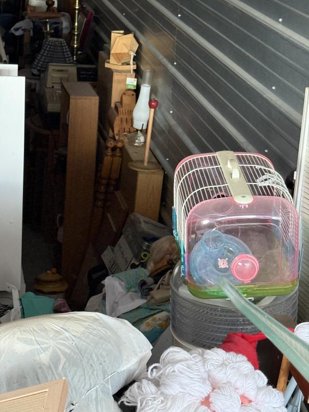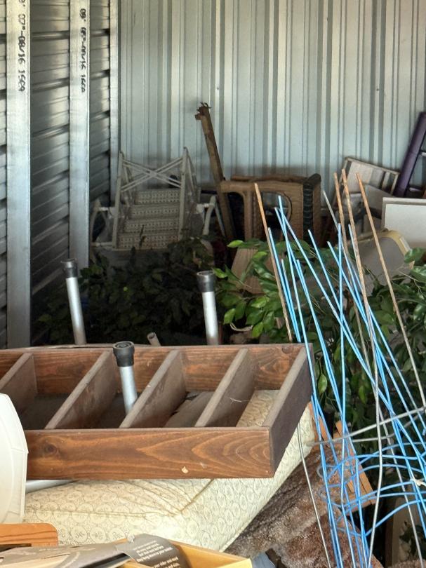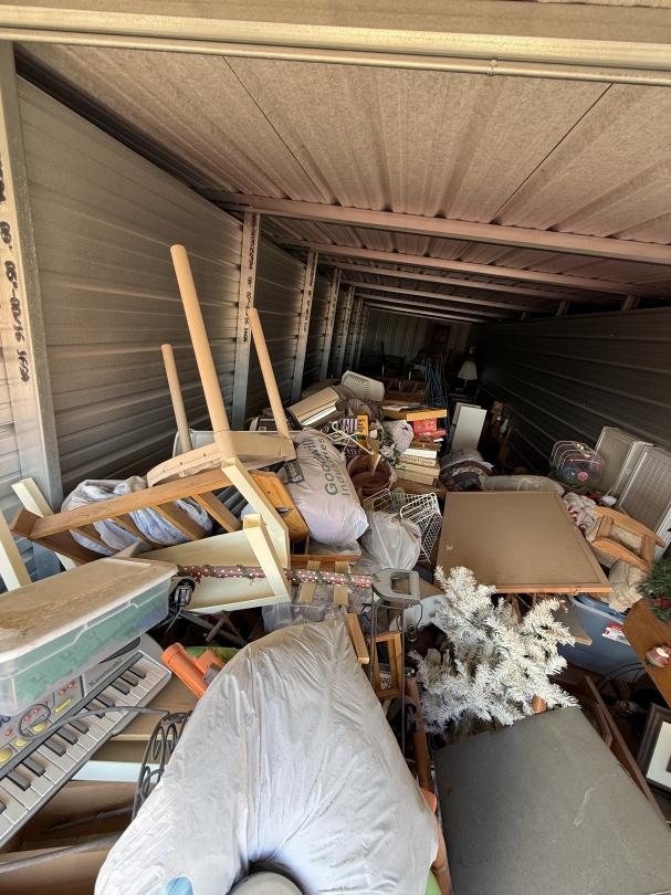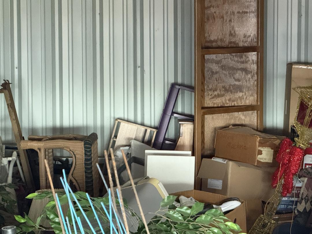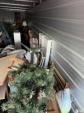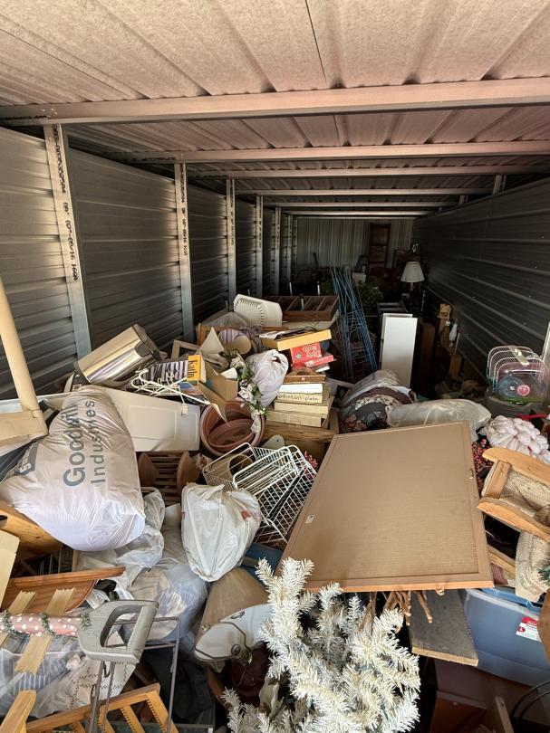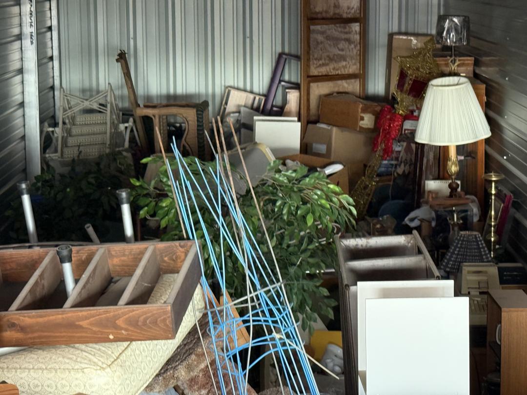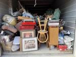 This unit appears to contain…Stack On Tool chest (top & bottom), Homak portable tool box, oak cabinet, couch, baseball glove, cooler, artificial plants, board games, rocking chair, swivel bar chairs, wicker end tables, kid's bed, wall art, collectible decorative plates, pots for plants, kitchen pots & pans, trash can, plastic shelving, small pet cage, desk organizer, picture frames, Christmas decorations, decorated Christmas trees, shevling units, totes, boxes, and other household items.