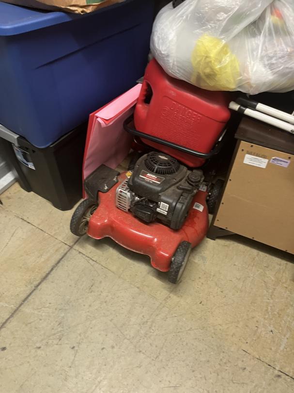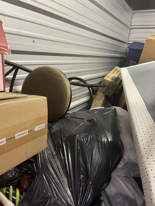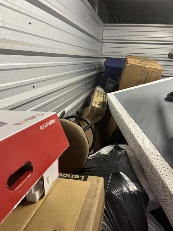 This unit appears to contain…climate Controlled mattresses, box springs, boxes, chest, 3 ac units, lawn mower, chairs, coolers, tvs